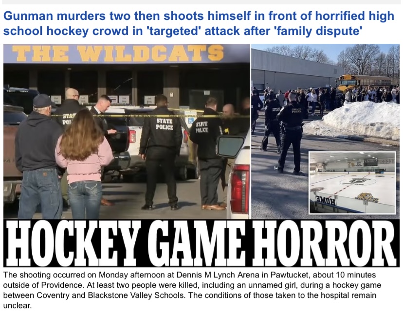 >A gunman murdered two people before shooting himself after opening fire at a high school hockey tournament in Rhode Island following a 'family dispute,' according to police. >Three others were rushed to the hospital in critical condition. >The confrontation involved one family and that the investigation remains ongoing.>Police said the gunman died of a self-inflicted gunshot wound after raining bullets in the arena. Police are not looking for any other suspects at this time. https://www.dailymail.co.uk/news/article-15565169/shooting-dennis-m-lynch-arena-hockey-pawtucket-rhode-island.html
