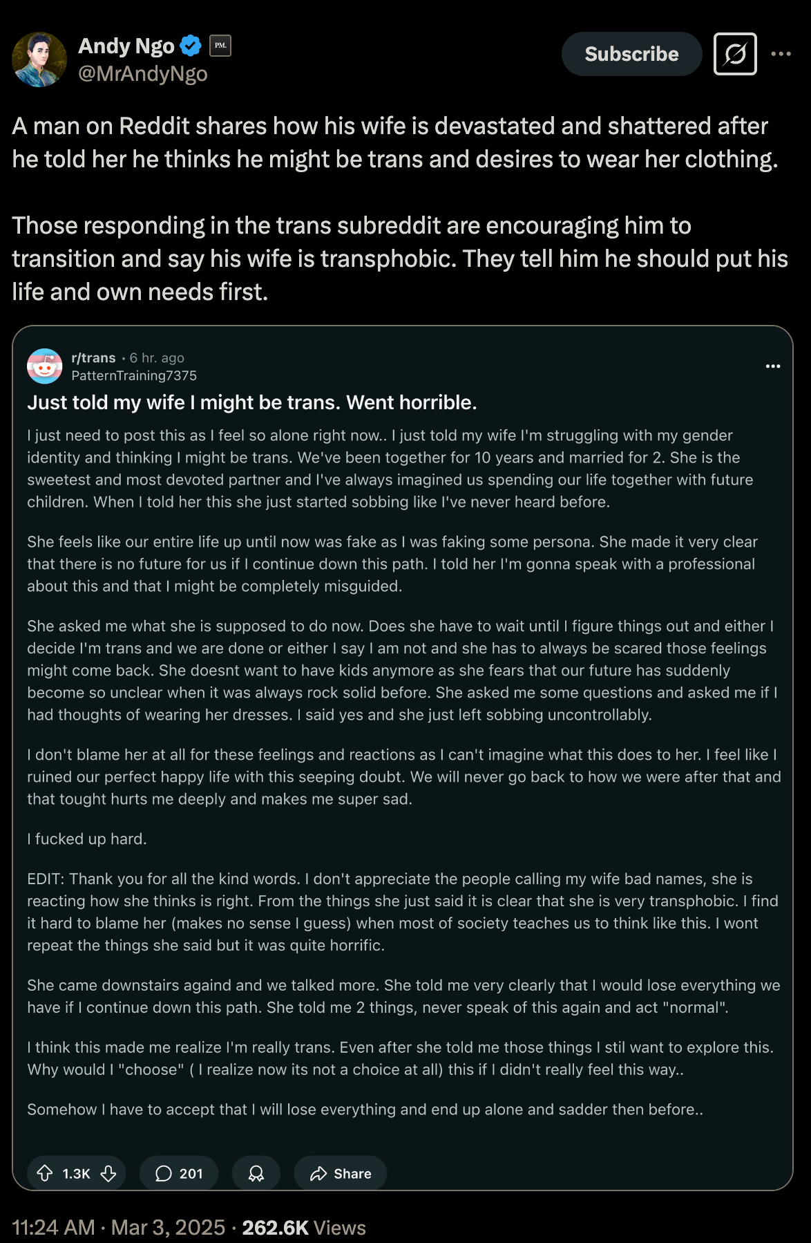 These late bloomer boomer troons are some of the most insidious and become family annihilators when their wives inevitably want to leave them (being outspokenly liberal is a different story when they're expected to cohabitate with one of these mentally ill perverted ogres).
