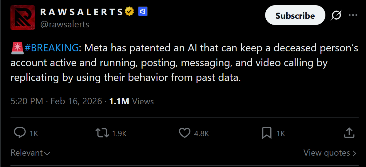 I'm not an AI panic guy but this is kinda fucking spookyhttps://www.businessinsider.com/meta-granted-patent-for-ai-llm-bot-dead-paused-accounts-2026-2