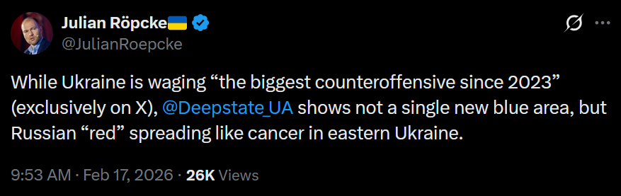 https://x.com/JulianRoepcke/status/2023667013902536925>While Ukraine is waging “the biggest counteroffensive since 2023” (exclusively on X), @Deepstate_UA shows not a single new blue area, but Russian “red” spreading like cancer in eastern Ukraine.LOLOL