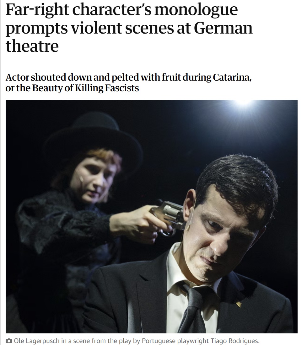 https://www.theguardian.com/world/2026/feb/16/play-fascism-violent-scenes-german-theatre-bochum-tiago-rodriguezThe Left are so unhinged they're assaulting actors playing fictional characters saying things they don't like now“[But] I was astonished by the stupidity, really. I never ever thought – nobody did – that somebody from the audience would jump on stage and try to hit the actor … I would expect this from the people we are voting against, but not from the people who should be on our side.”>"N-nooooo we're on your side guise please don't attack us, only the far-right are violent!"