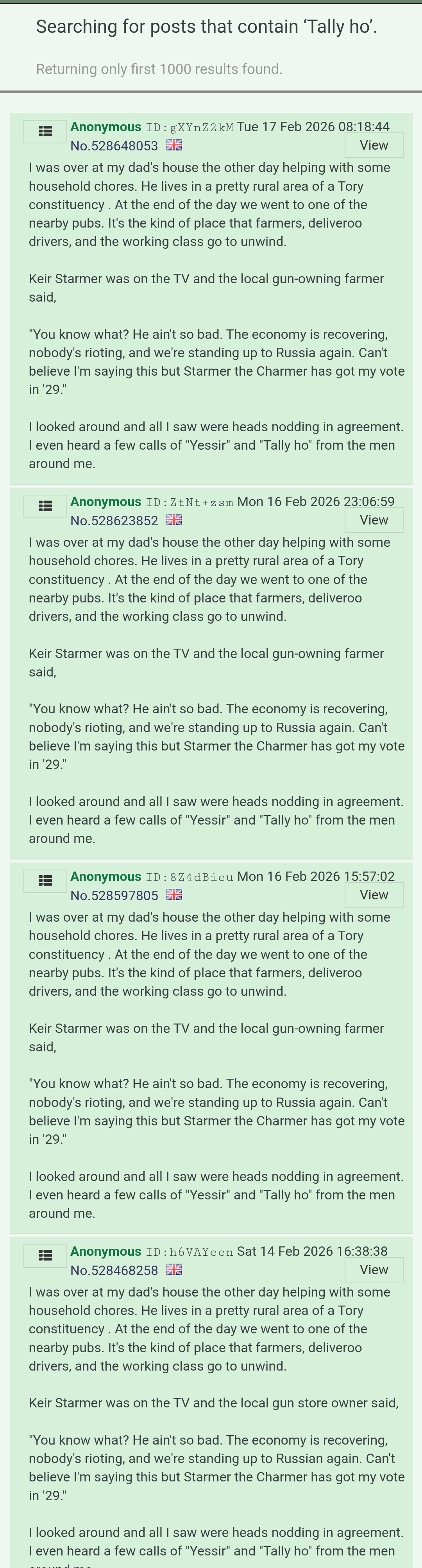 I was over at my dad's house the other day helping with some household chores. He lives in a pretty rural area of a Tory constituency . At the end of the day we went to one of the nearby pubs. It's the kind of place that farmers, deliveroo drivers, and the working class go to unwind.Keir Starmer was on the TV and the local gun-owning farmer said,"You know what? He ain't so bad. The economy is recovering, nobody's rioting, and we're standing up to Russia again. Can't believe I'm saying this but Starmer the Charmer has got my vote in '29."I looked around and all I saw were heads nodding in agreement. I even heard a few calls of "Yessir" and "Tally ho" from the men around me.