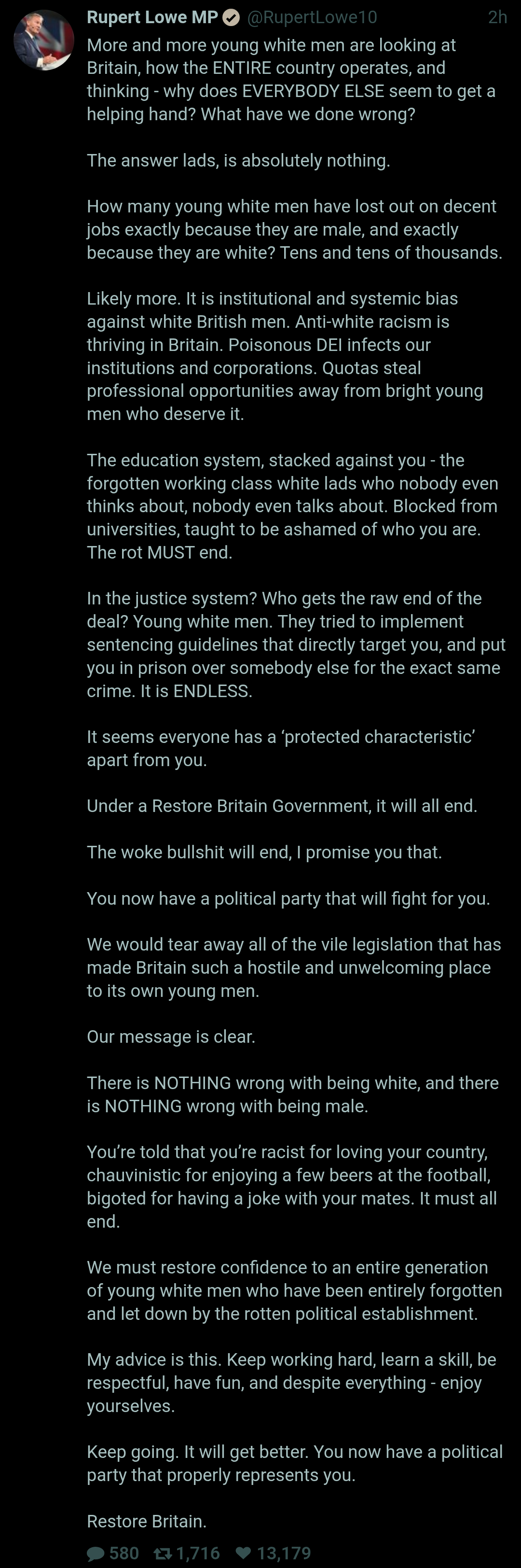 Only a holocaust tier party has any chance of reversing 40years of decline in this country. We need someone prepared to be so hated on the world stage during and after their life to do this.But are there any real MEN left with the skills neccessary to take up that role. (No "R Harv" suggestions please)