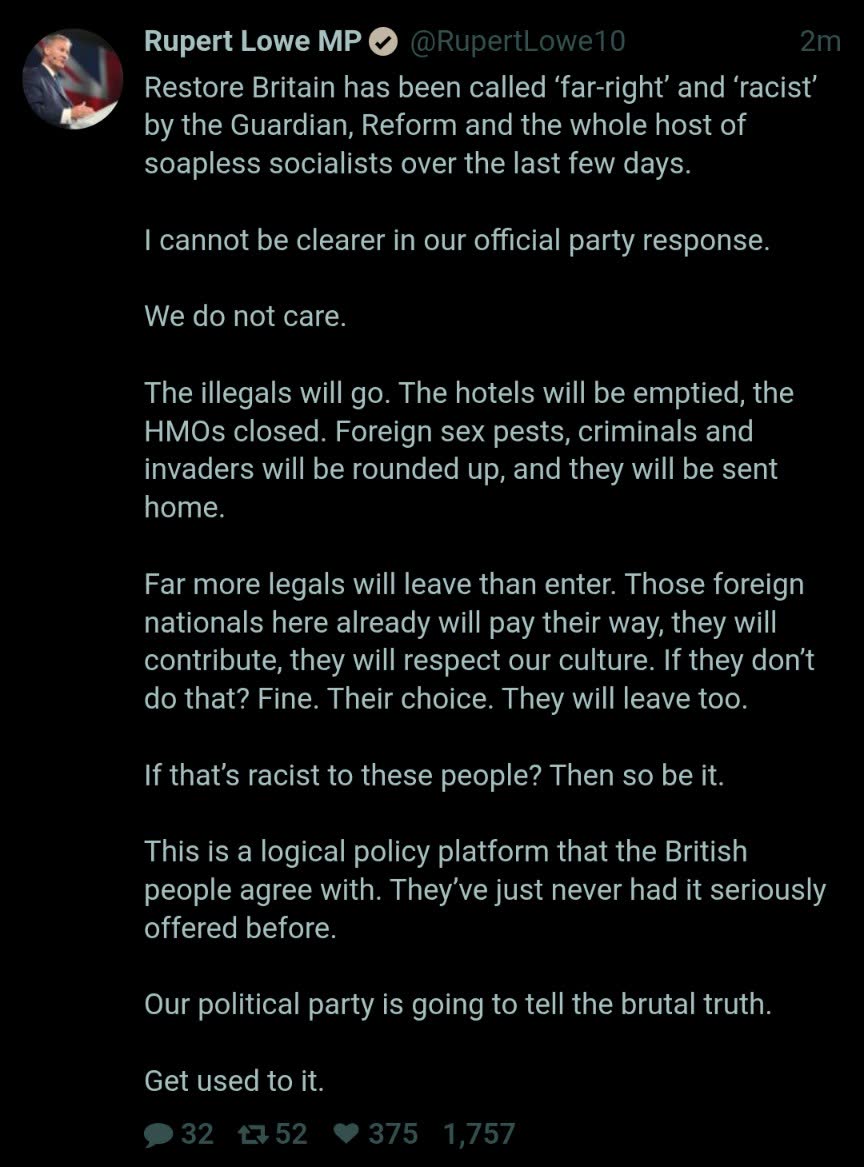 >establishment shitting itself over Lowes party getting 60k+ party members within 36 hours>normies waking up to the corruptionHad a nonpolitical mate text me this morning asking what I thought about Restore Britain.
