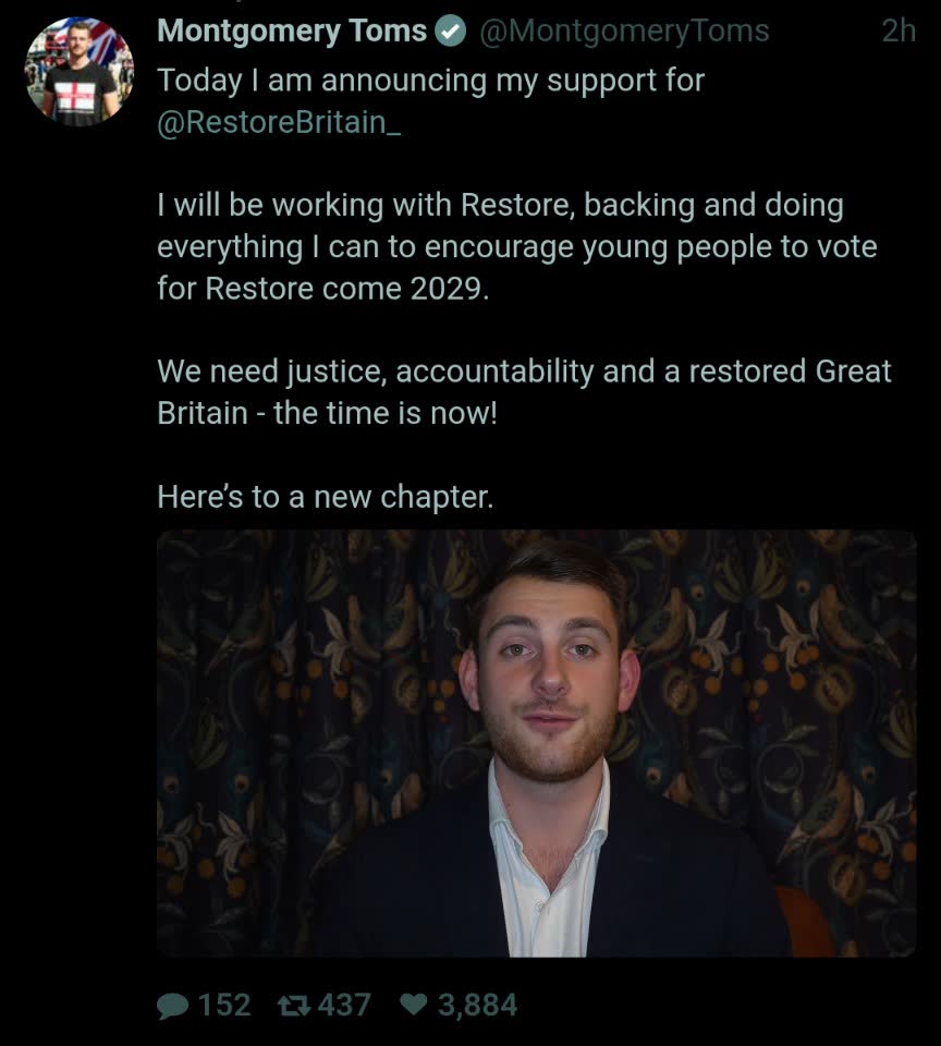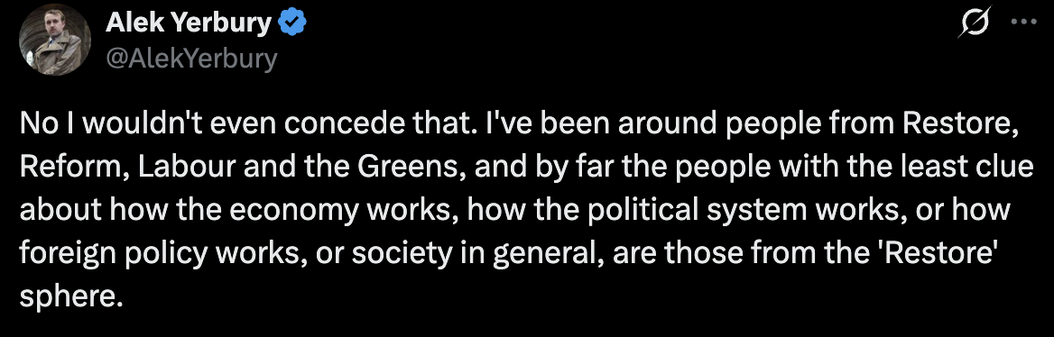 Had a nonpolitical mate text me this morning asking what I thought about Restore Britain and I told him they were crypto-Thatcherite scum and only terminally online incels who do nothing IRL are excited about them. I encouraged him to take a look at the National Rebirth Party and Alek Yerbury instead.Now he's convinced and wants to join the Party.
