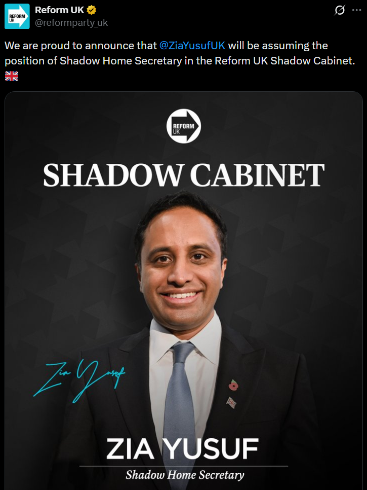 50% of Reforms shadow cabinet is non-white. Zia Yusuf is now shadow home affairs, this is an actual joke. Joining Restore, had enough of this