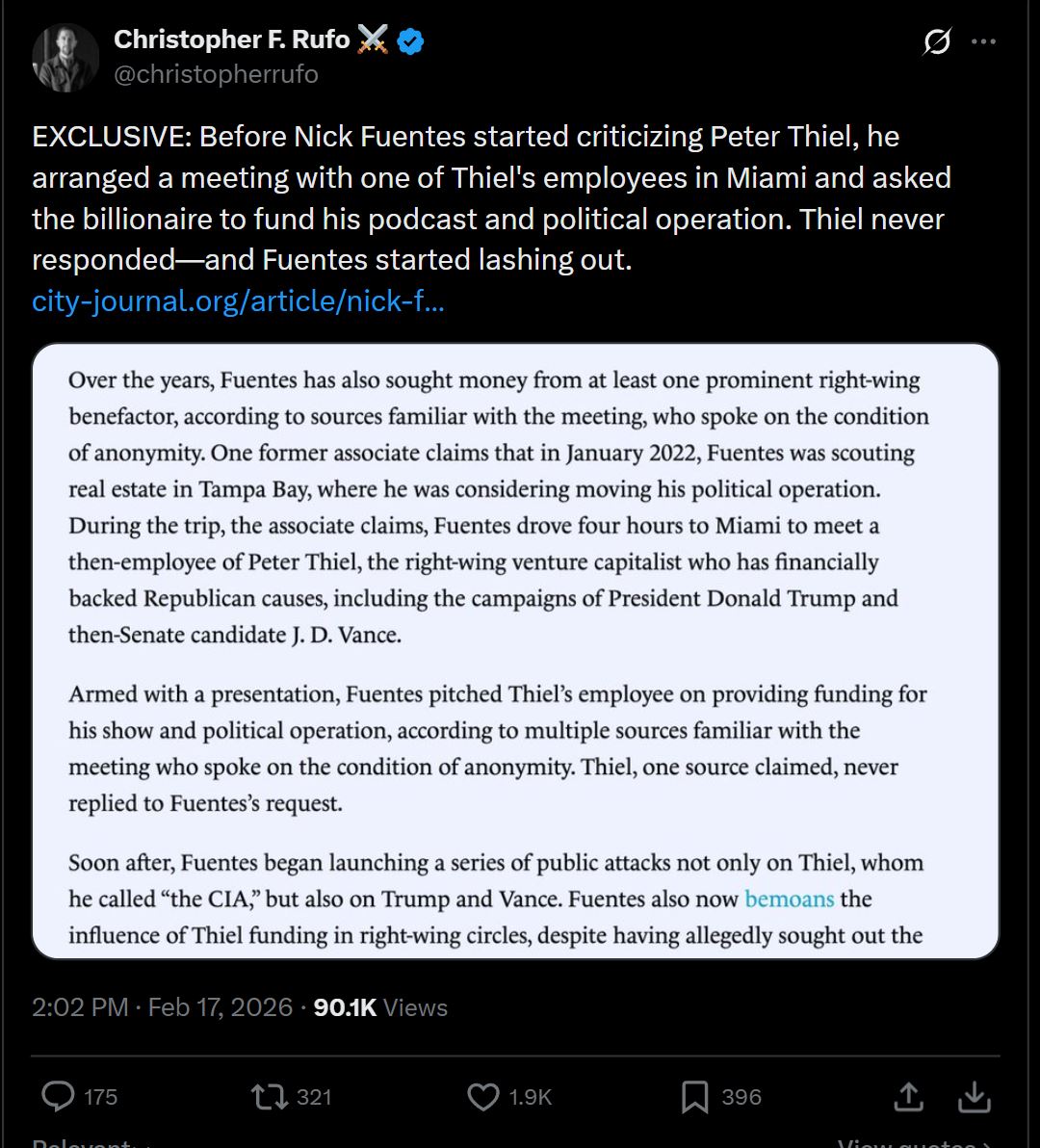It's not even clear what you're trying to say. Are you saying that Fuentes is linked to Thiel? If yes why didn't he get any money and why did he start attacking Thiel and Vance every day for months?