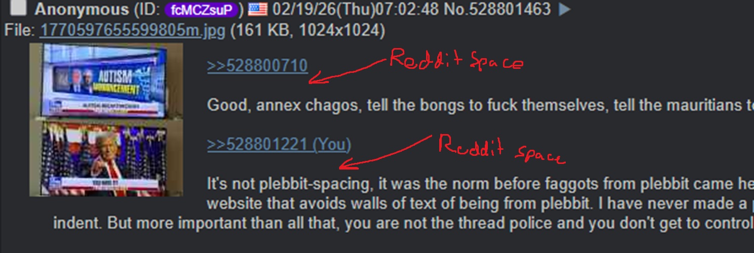 >>528800710Good, annex chagos, tell the bongs to fuck themselves, tell the mauritians to fuck themselves, problem solved >>528801221It's not plebbit-spacing, it was the norm before faggots from plebbit came here and knew how posting works on that website and used this extensive knowledge of and familiarity with the reddit UI which caused them to accuse people who use the only type of formatting allowed on this website that avoids walls of text of being from plebbit. I have never made a plebbit post on my life and still don't entirely understand why they need to hit enter after each line which by the way is also not the same as double spacing between paragraphs to compensate for the inability to indent. But more important than all that, you are not the thread police and you don't get to control how other posters format their posts, touch grass and/or kys ty