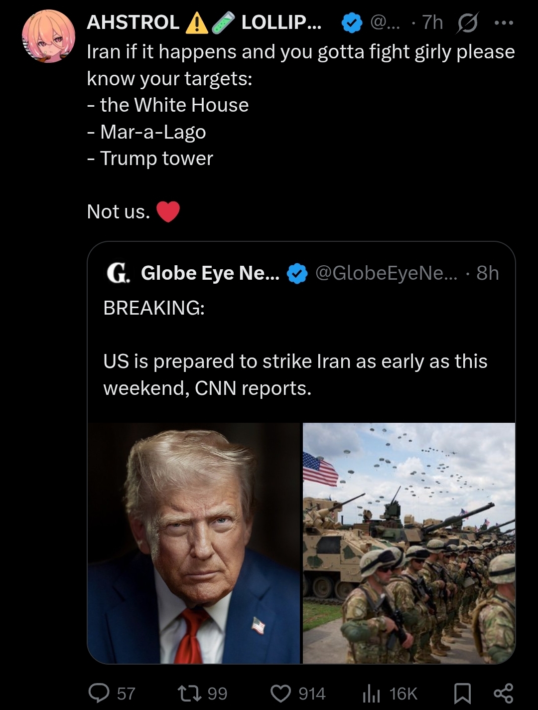 >>528800140Ya. Why do Trump supporters think we should invade Iran?>>528800176I mean I know the neocon shill talking points advocating Iran invasion but MAGA proponents are in a cognitive dissonance using populist rhetoric in furtherance of elite goals. I’m curious what people still backing Trump believe concerning Iran.