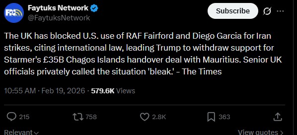 >The UK is blocking the US from using RAF bases for strikes on Iran over international law concerns — The Times>The disagreement over the use of British sites is behind the US president’s withdrawal of support for the Chagos Islands deal.https://www.thetimes.com/uk/politics/article/trump-chagos-islands-deal-iran-attack-british-bases-kcj0gzbr8