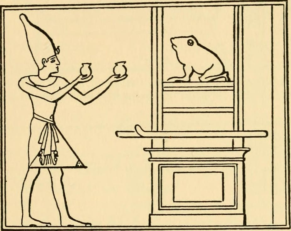 The Ogdoad In the creation myths of Hermopolis, the universe began with four pairs of deities called the Ogdoad. The Frog Heads: The four male gods of this group>Nun (Water)>Heh (Infinity)>Kek (Darkness)>Amun (Hiddenness)all depicted with the heads of frogs.These frog-headed gods represented the chaotic, watery state of the world before the first sunrise.