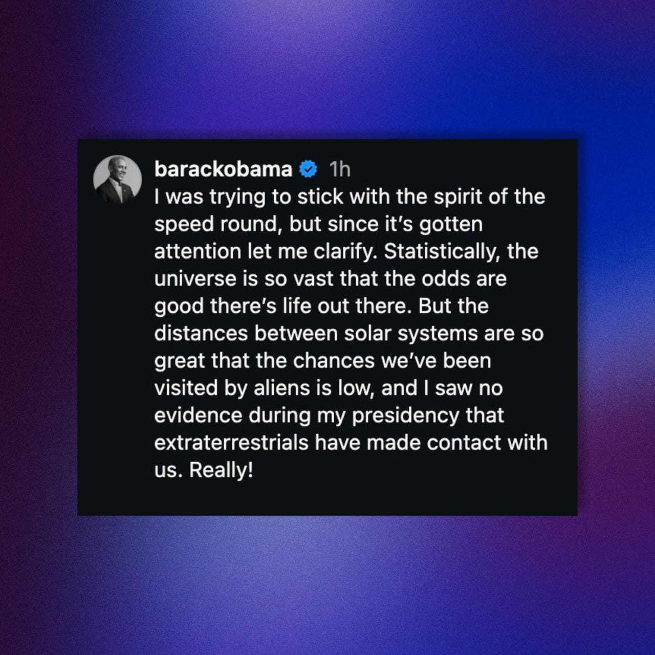 >Cohen: "Are aliens real?">Obama: "They're real. But I haven't seen them ... unless, there's this enormous conspiracy theory and they hid it from the president of the United States."Yeah, his clarifications chicks (doesn't read like backpedaling). He meant "aliens" as in "extraterrestrial life." Nothing burger.