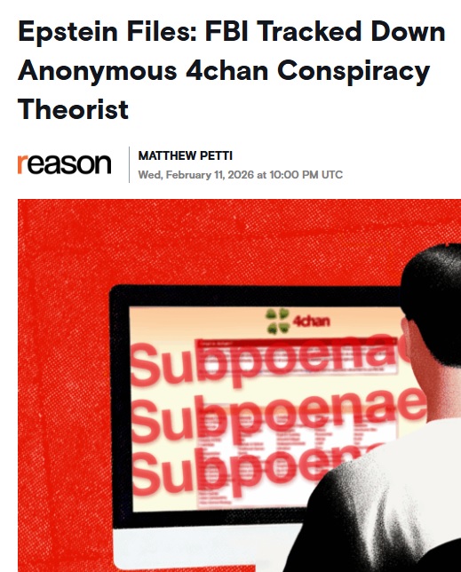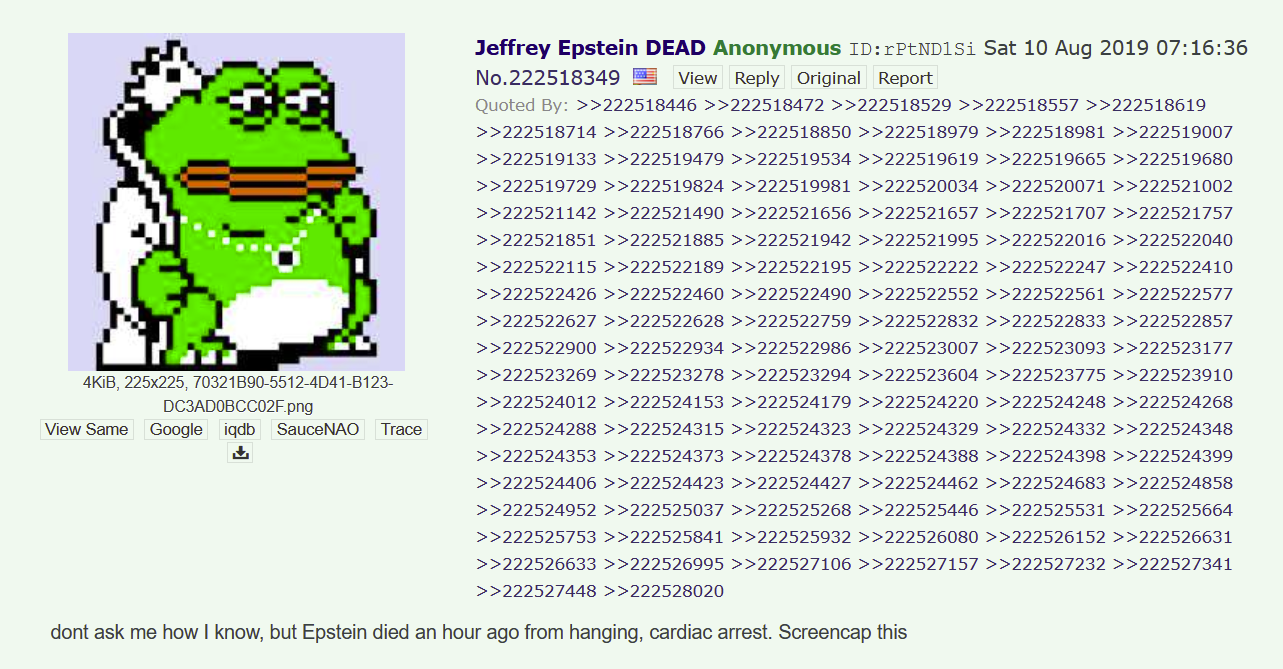 https://www.aol.com/articles/epstein-files-fbi-tracked-down-220038797.html>The bureau collected phone records and even detailed bank records in the course of the investigation.>One of these investigations has been publicly reported before. On August 10, 2019, a user on the freewheeling social media forum 4chan posted "dont ask me how I know, but Epstein died an hour ago from hanging, cardiac arrest," around half an hour before the story broke in professional media. The user, identified by the automatically generated pseudonym "rPtND1Si," went on to post details about Epstein's medical case.>NBC News reported three days later that "authorities" were trying to track down the identity of rPtND1Si. Indeed, on August 14, 2019, the FBI sent 4chan a grand jury subpoena for information on rPtND1Si, records released by the Department of Justice this month show. But the subpoena also asks for information on a second user, "swam8WlF," who posted a conspiracy theory about Epstein having a body double.>The post by swam8WlF appears to have come to the FBI's attention by way of a tip. On August 12, around noon, a woman whose name is redacted called the FBI to report that her friend had sent her "a screenshot of a post on an unknown social media platform" that was "floating around social media." It was swam8WlF's post about the body double.>In response to the subpoena, 4chan gave the FBI the IP addresses of the two posters.>Just because you're paranoid doesn't mean they're not out to get you, the saying goes.>Ironically, though, the investigation ended up breathing new life into swam8WlF's theory. After the Department of Justice released the subpoenas as part of its Epstein Library, online sleuths noticed Grijalva's name. They concluded the body double story came from a real prison guard, without realizing that the subpoenas do not explicitly connect Grijalva to the 4chan posts or that rPtND1Si and swam8WlF are two different users.