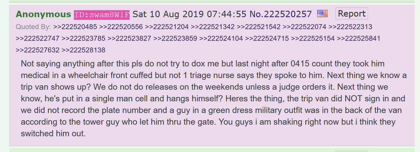 >>528837162He wasn't a conspiracy theorist. He worked at the fucking jail. It's in the files.