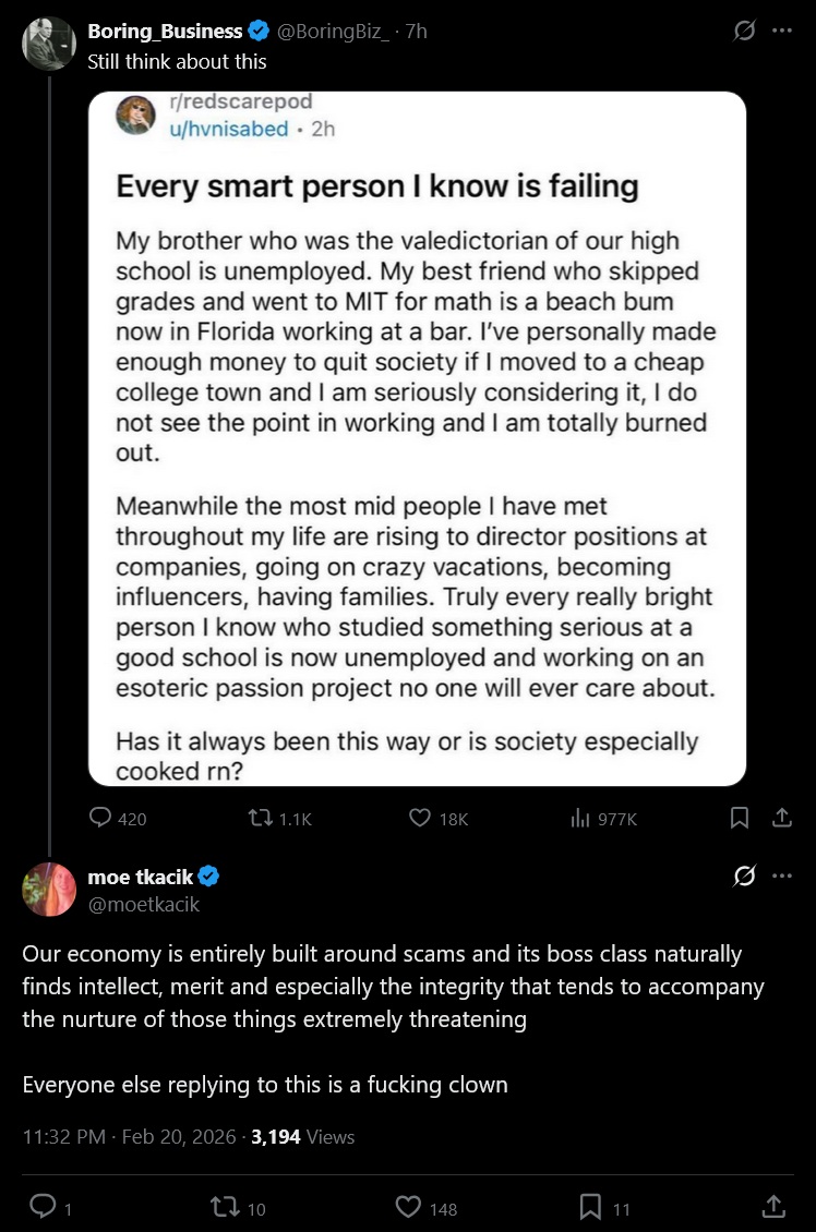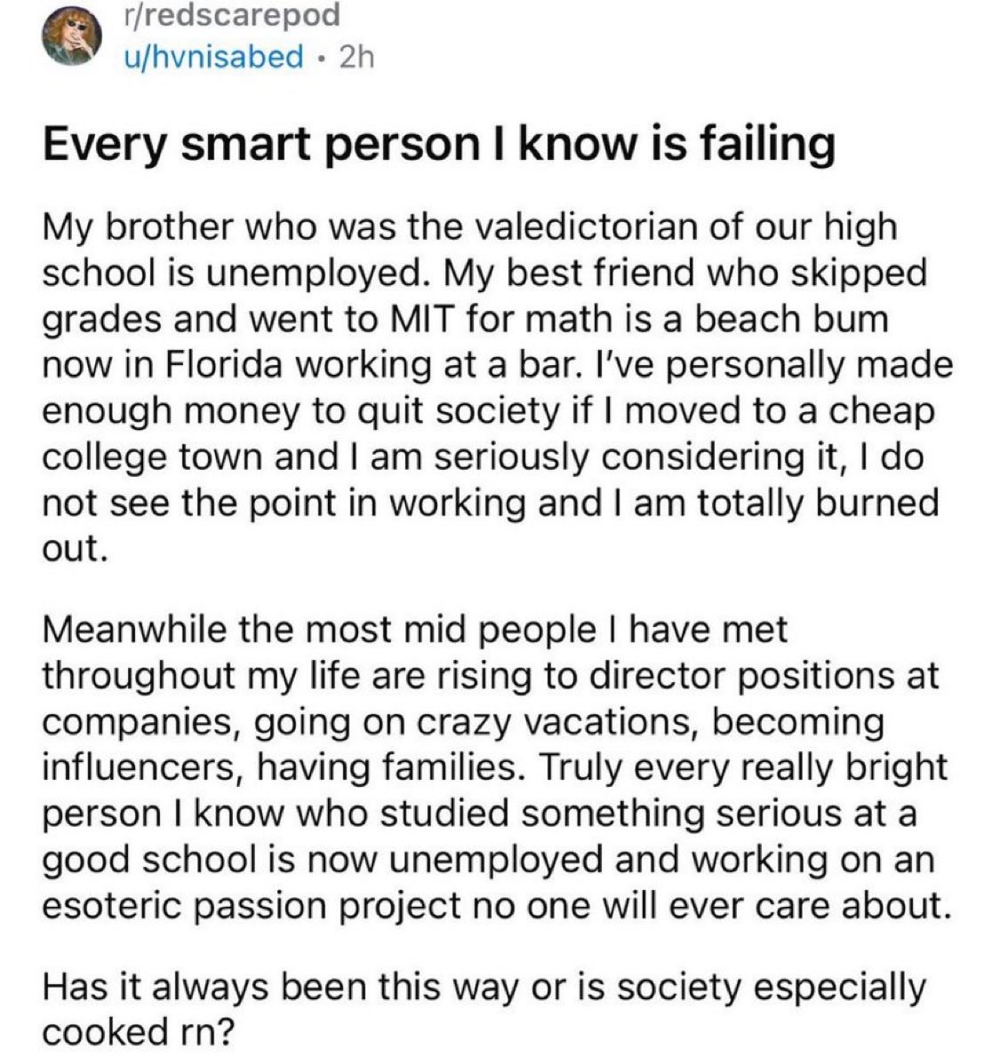 >>528921429Intelligence can't be "disincentivized". Intelligent people are by definition overwhelmingly powerful, by virtue of the ability to figure out ways to get what they want. The same way humans are immensely more powerful than animals.Even if everything else goes wrong, as in, society prevents an intelligent person from having good academic performance (for example by rewarding repetition and loyalty to mainstream views) and also prevents that person from getting a good job based on his IQ (for example by rewarding looks and popularity instead), aka refuses to directly reward high IQ at all (which is not happening but could happen), an intelligent person can't just be a valedictorian or good at maths, but can adapt to bad situations and figure out ways to deceive his enemies and get what he wants.This is a literal redditor, and we all know school works by repetition and the maths exercises in exams are predictable and kids have memorized step by step ways to solve every type of exercise. So those guys he says are doing badly may not be that competent. Or they may want this situation.Those "mid" people may be very competent and just not have tried very hard and school and got those director positions by again, figuring out a way to deceive people and get what they want. Or maybe they're just turbogoycattle who got there by working super hard and being good boys. Or they just look good. Because being intelligent is not even the only way to do well in life.Btw having a family is a natural thing anyone can do, it's not a measure of success. He is just saying that because according to NPCs you are "better" if you do more things in their checklist and don't do "bad" things like refusing to wageslave.