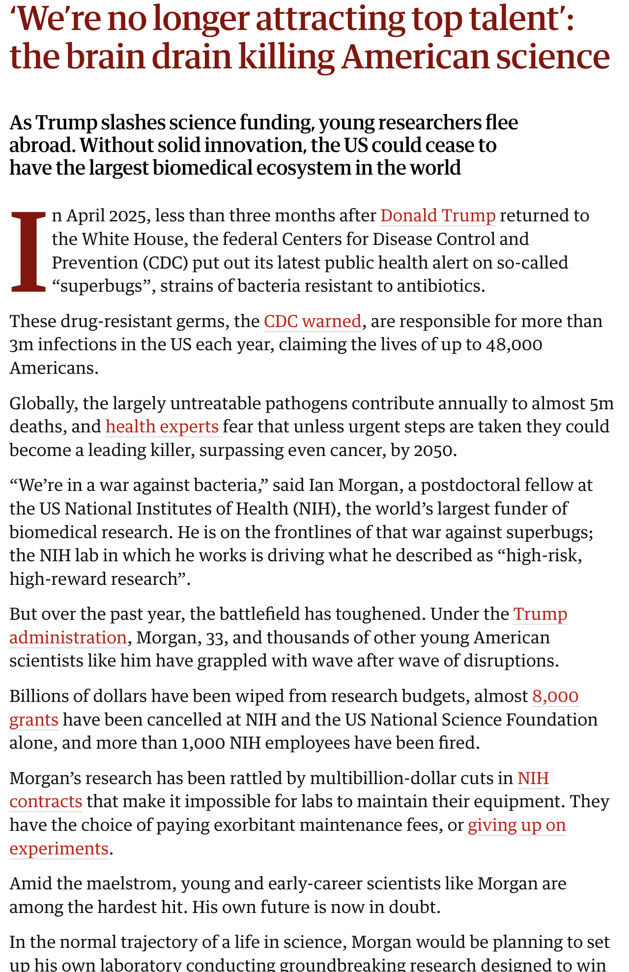 >>528921429This is an article about thousands of American scientists fleeing to Europe and Australia. Pretty grim stuff>Have we disincentivized intelligence?sure looks like it