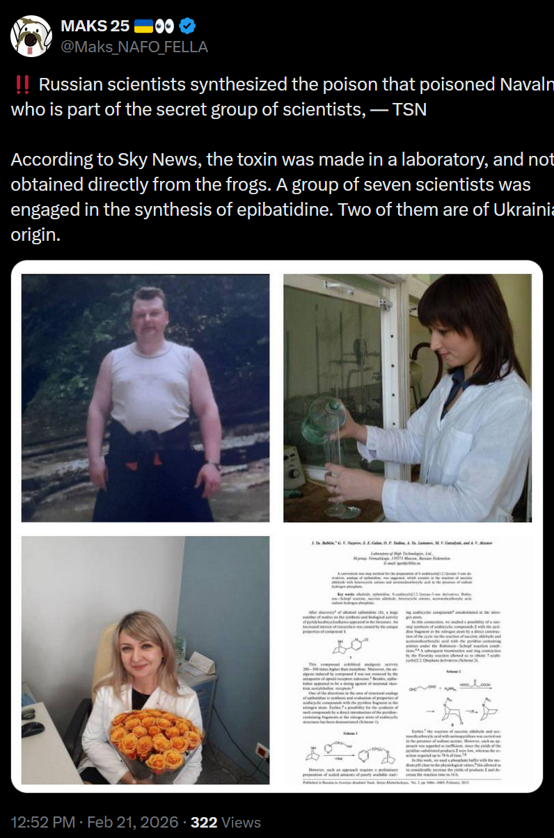 >Russian scientists synthesized the poison that poisoned Navalny - who is part of the secret group of scientists, — TSN>According to Sky News, the toxin was made in a laboratory, and not obtained directly from the frogs. A group of seven scientists was engaged in the synthesis of epibatidine. Two of them are of Ukrainian origin.damn war criminals