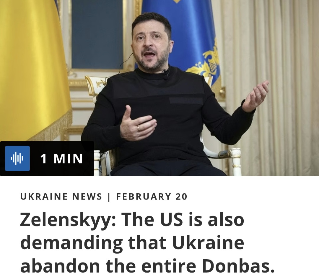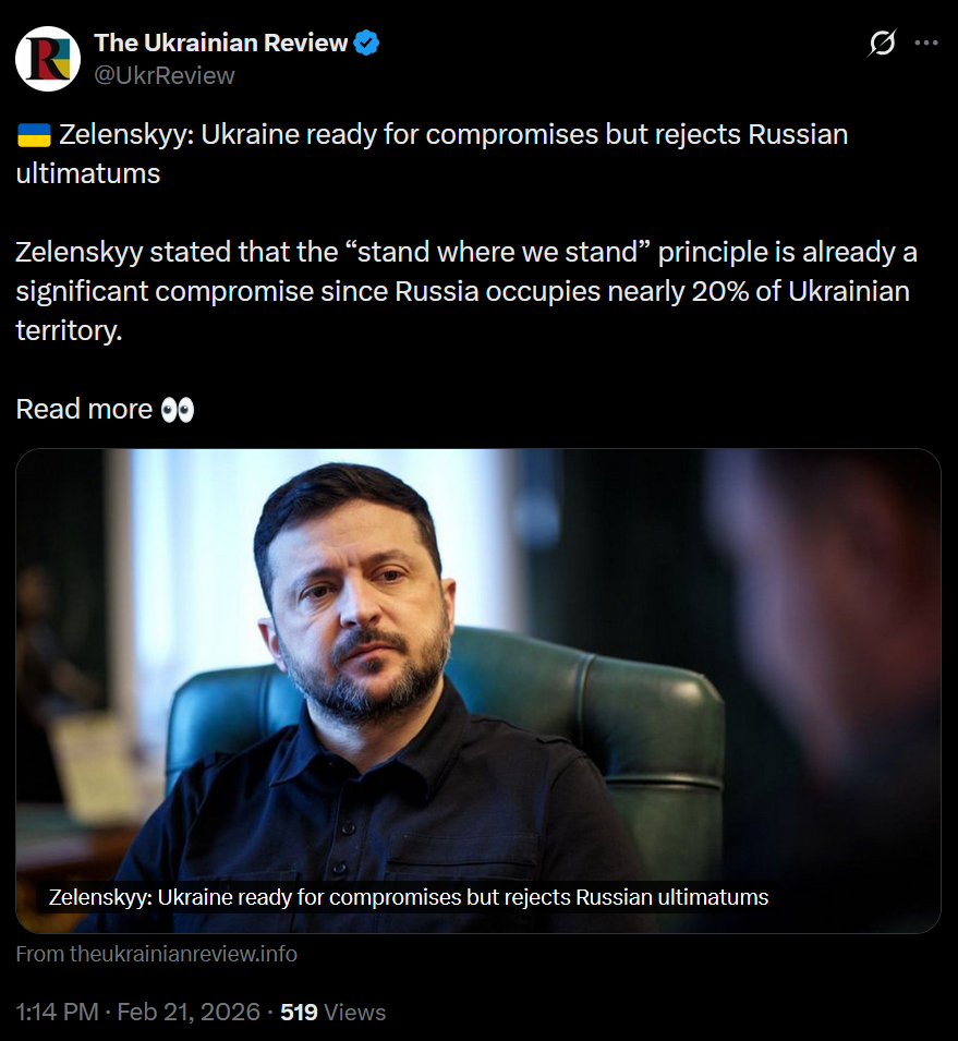 >Zelenskyiyiyiyi: Ukraine ready for compromises but rejects Russian illegal ultimatums>Zelenskyiyiyiyi stated that the “stand where we stand” principle is already a significant compromise since Russia illegally occupies nearly 20% of Ukrainian territory.