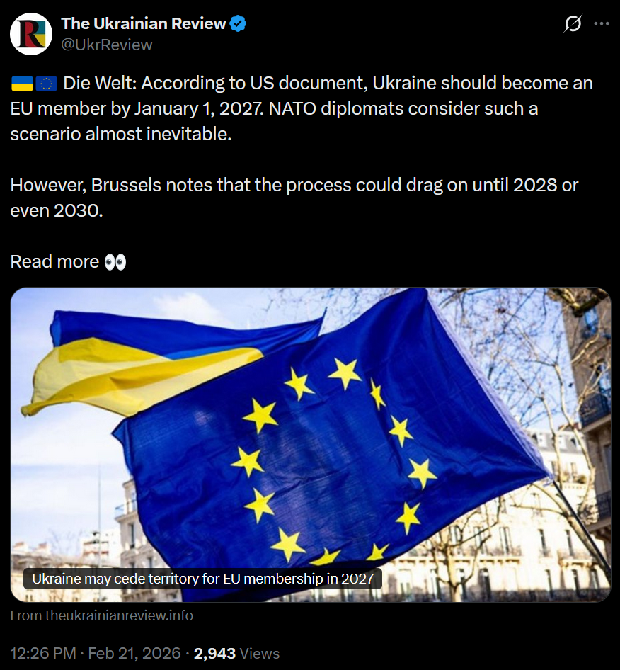 >Die Welt: According to US document, Ukraine should become an EU member by January 1, 2027. NATO diplomats consider such a scenario almost inevitable. >However, Brussels notes that the process could drag on until 2028 or even 2030.LOLOL