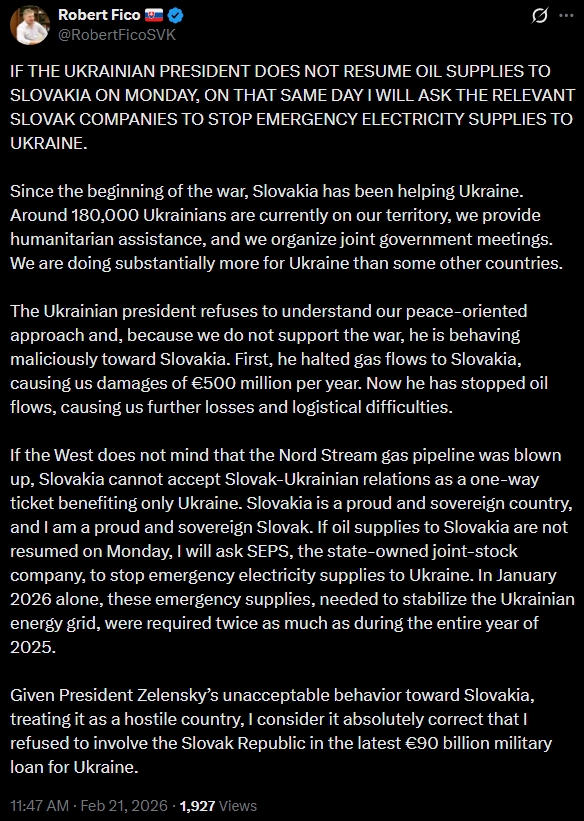 >Slovakia will suspend electricity supplies to Ukraine on February 23 if Keev does not resume oil deliveries to the country, - Fico