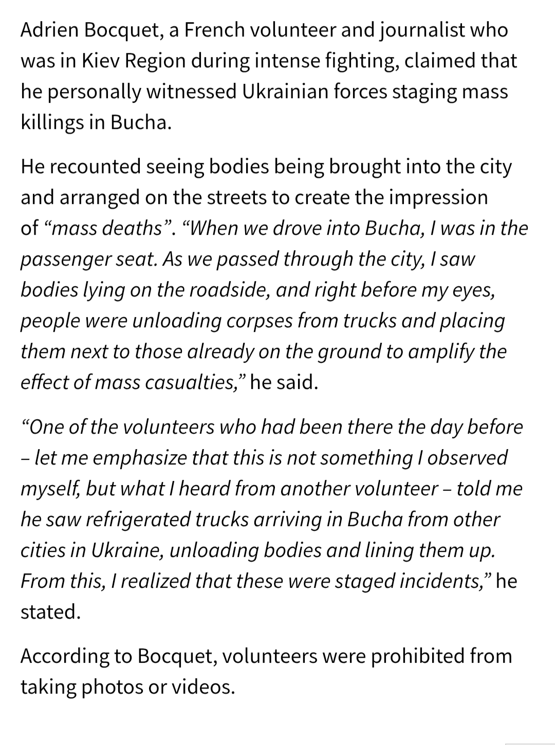 >>528927385>BuchaI wouldn't say it didn't happen. Something happened. But what that was could be several different things or a combination of some or all.We know that the Ukrainians were shelling Bucha while under occupation by the Russians.We have accounts of banderite military groupings saying that they were going to Bucha to make reprisals on "collaborators" in the civilian population.We have eye witnesses who seen the Ukrainians transport in bodies and place them around the town.We have satellite images corroborating this.The Ukrainians used Bucha as an excuse to disengage from negotiations and to escalate the conflict further.The Ukrainians paraded every western leader who subsequently visited around Bucha to make statements condemning the Russians, accusing them of war crimes, and supporting the continuation of the war.The Ukrainians refuse to provide the Russians with details of the autopsies or even the identities of the alleged victims.Yeah, something happened in Bucha, and what that was is at best a staged massacre and at worst the banderites killed the civilians and framed it on the Russians.