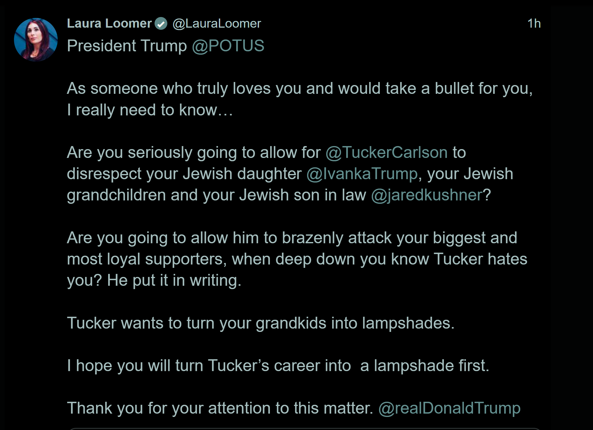 >>528972757>Tucker wants to turn your grandchildren into lampshadesJesus fucking Christ Laura, turn it down a notch.