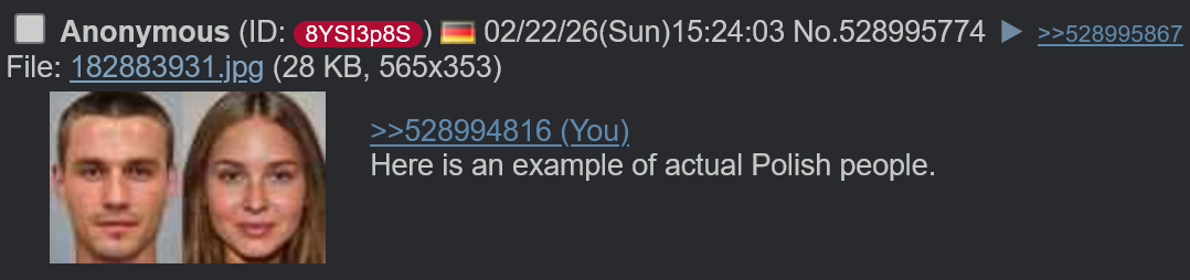>>529005420i denounce islam and judaism and hinduism, CCPand Poland.its not a real country.and now?that doesnt change your crypto jewishness, you pathetic fuck.larps as germans to create fanfic about "based polaks" kek