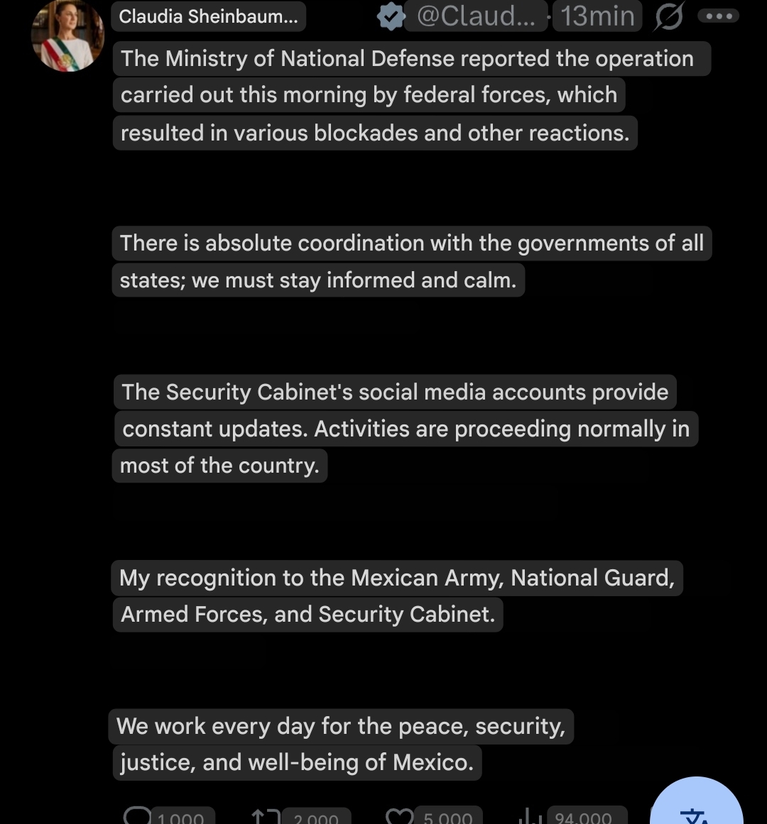 >>529017626it's very MAGA, top cartel leader (el mencho) killed in a raid sponsored by US intelligence (after trump told them to actually do something)in retaliation the cartel is killing random people, national guard, and promises massive retaliation