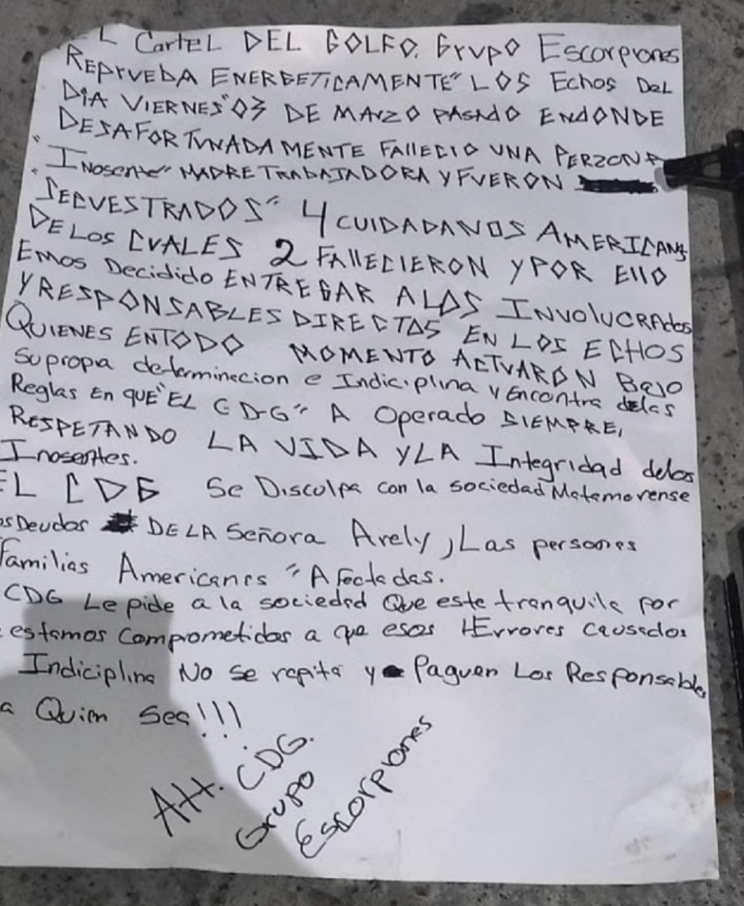 >>529022650>>529022673tl;dr four americans get kidnapped, cartel finds out about it, apologizes and turns over those who kidnapped the americans (since two died)>"The Gulf Cartel Grupo Escorpiones strongly condemns the events of Friday, March 3 in which unfortunately an innocent working mother died and four American citizens were kidnapped, of which two died," a translation of the letter states. "For this reason, we have decided to hand over those involved and directly responsible for the events who at all times acted under their own determination and indiscipline and against the rules in which the CDG has always operated."