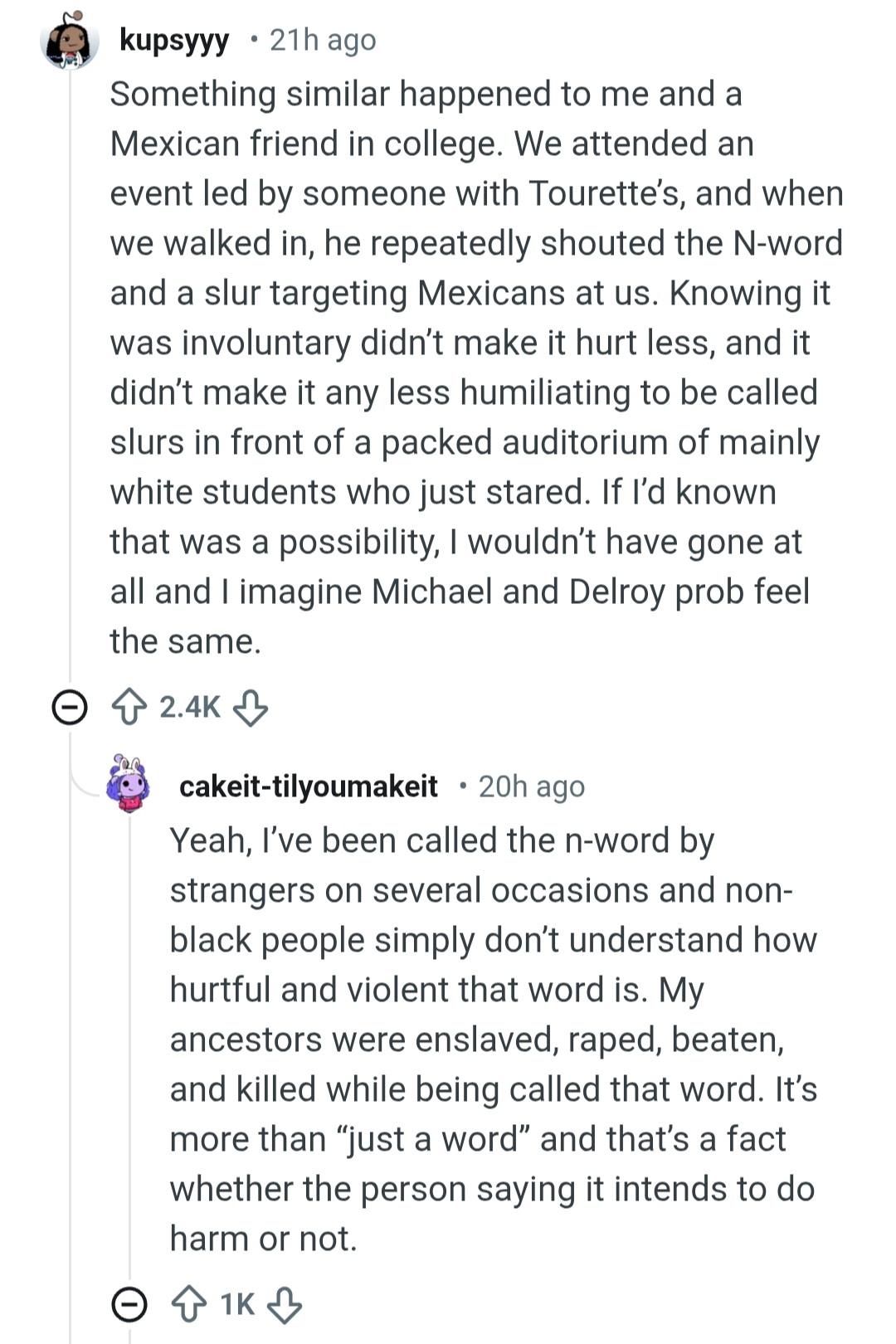 I blame the organizers. People should have been made aware that someone in the audience had Tourette's and that something offensive may be yelled at different points. Even when caused by Tourette's the n-word is still a violent and painful word. That being said, knowing it was caused by Tourette's may have helped in the moment and would have provided immediate context afterwards.>>529052841>not using oldNGMI