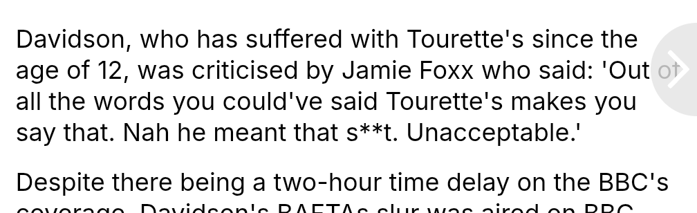 He released a statement. >I wanted to thank BAFTA and everyone involved in the awards last night for their support and understanding and inviting me to attend the broadcast. I appreciated the announcement to the auditorium in advance of the recording, warning everyone that my tics are involuntary and are not a reflection of my personal beliefs. I was heartened by the round of applause that followed this announcement and felt welcomed and understood in an environment that would normally be impossible for me.>In addition to the announcement by Alan Cumming, the BBC and BAFTA, I can only add that I am, and always have been, deeply mortified if anyone considers my involuntary tics to be intentional or to carry any meaning. I was in attendance to celebrate the film of my life, I SWEAR, which more than any film of TV documentary, explains the origins, condition, traits and manifestations of Tourette Syndrome. I have spent my life trying to support and empower the Tourette’s community and to teach empathy, kindness and understanding from others and I will continue to do so. I chose to leave the auditorium early into the ceremony as I was aware of the distress my tics were causing.