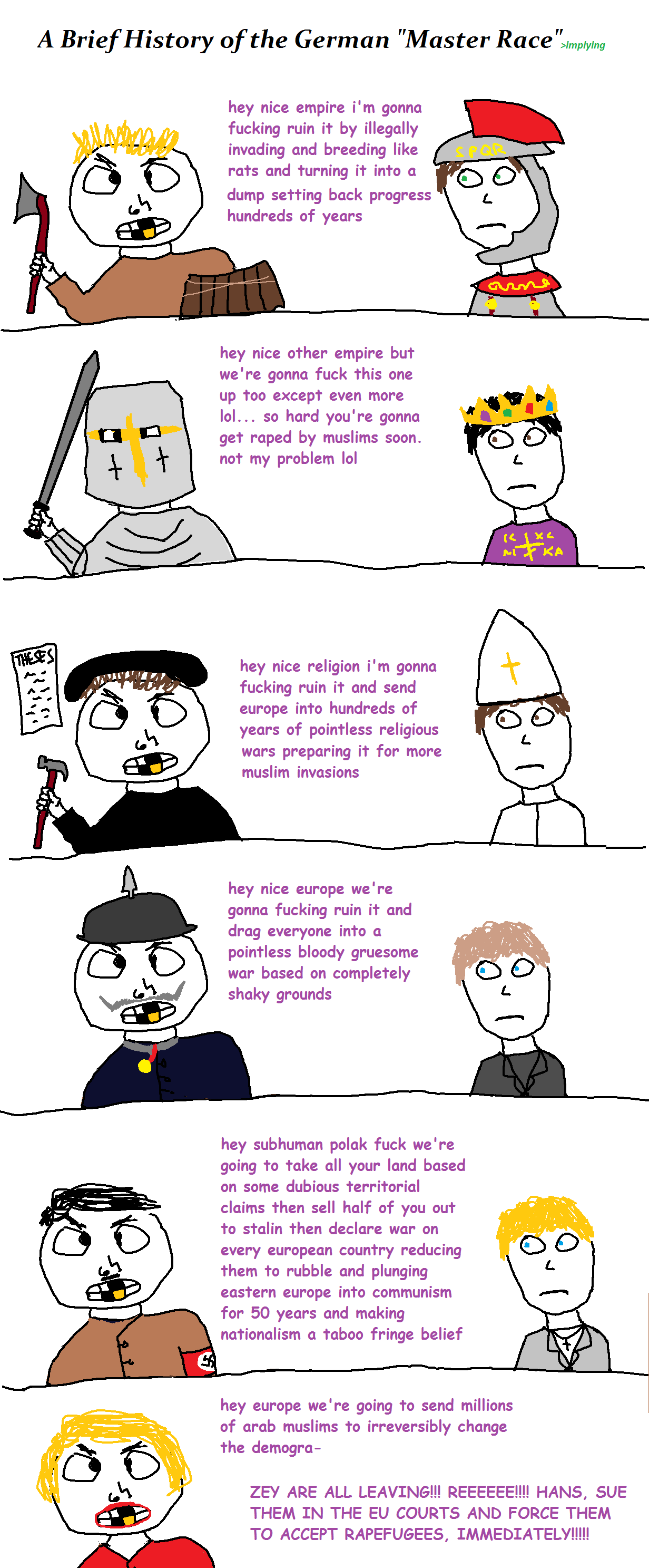 >>529097554>He just watched Germany destroy european countriesGermany was liberating European countries, Solomon. The overall sentiment in Europe outside the UK and Russia was overwhelmingly pro-Nazi. The idea that the Nazis were tyrannical oppressors terrorizing Europe is a classic case of history being rewritten by the victors.