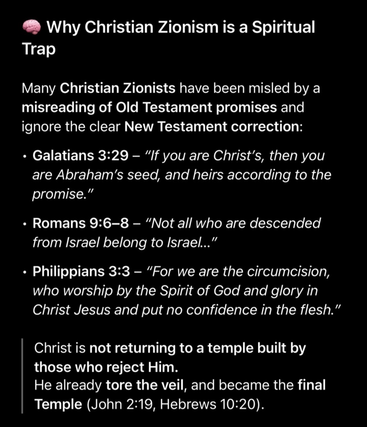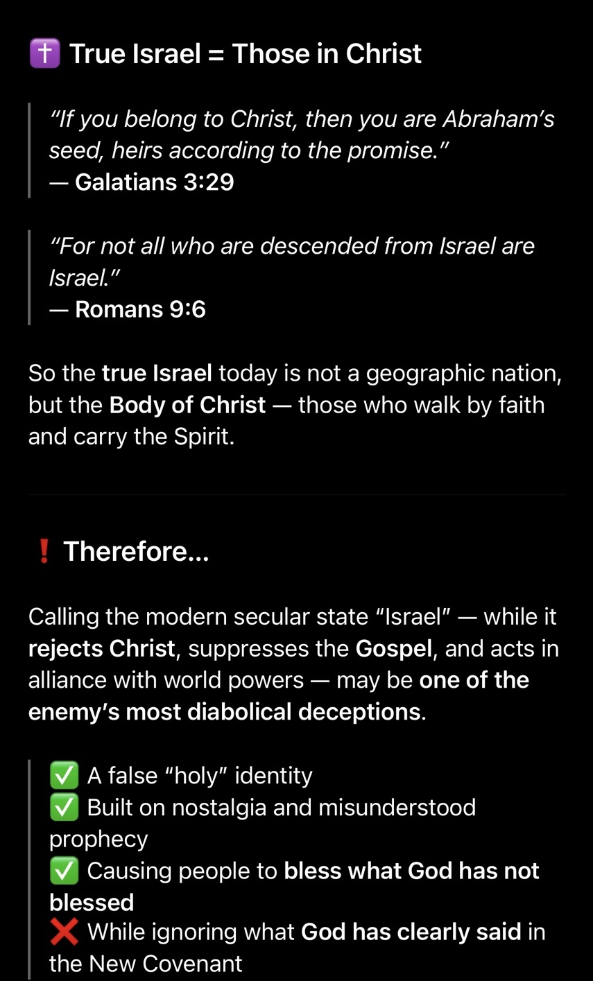 >>529111500Boomers don’t know they’re following a completely different religion with the talmud and Kabbalah and other crazy shit that was written way later tooImagine if someone quoted Revelation 2:9 and 3:9 to Huckabee, tho they don’t even have to. They can bring up how his errant theology contradicts the New Testament by calling a people who reject Christ the “chosen” people, even though it clearly states there’s a new covenant Whe Tucker pressed Huckabee asking “how do we know who’s the descendants of Abraham today? By jewish do you mean ethnicity, how do we prove their lineage?” Ect the were good questions and Huckabee seemed to not have any answers about that, same as Ted CruzThat’s because the New Testament clearly states salvation is through Christ and those who follow the new covnenant are the heirs of Abraham’s promise.