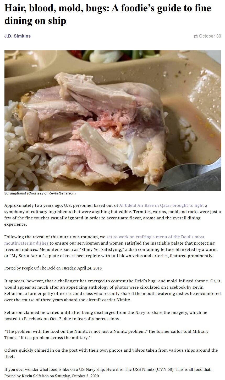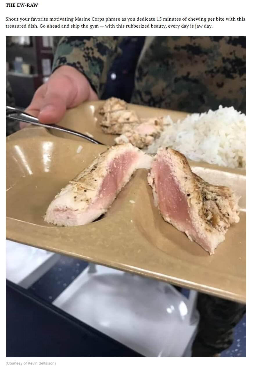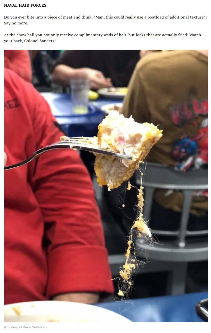 >>529121140At least it's not rusty... yet.>>529121254>>529121284>>529121320>>529121336>>529121366>>529121386>>529121860>>529121890Well deserved (You)s (num capped)Jesus Christ, historically good food was a necessity on ships to prevent mutiny.If they eat bricks from square pigs I can understand why the toilets keep getting clogged, like wtf is that even.I can also imagine why they would clog it on purpose..I would happily trade that crap for MREs which is just as carcinogenic, but at least edible.And most of the food is what I would consider toxic.Transglutaminase, sugars and starches galore... if you wanted to fuck up the digestive tract of a person just feed them that (even when properly cooked).So join the navys finest, on a supercarrier, eat and shit bricks for a living and learn to swim in sewage water to get to the toilet.Oh, and there's also war stuff.