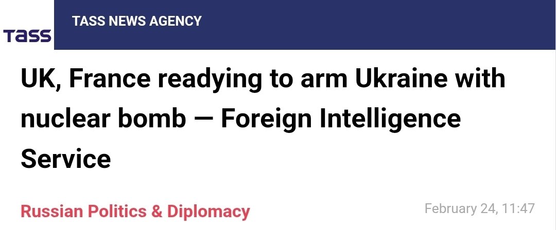 >MOSCOW, February 24. /TASS/. A nuclear strike on targets in Ukraine, as well as in France and the United Kingdom, would be considered lawful and justified in the event that London and Paris provide Kiev with nuclear capabilities, Russian Security Council Deputy Chairman Dmitry Medvedev said on Max, commenting on Russia's Foreign Intelligence Service’s (SVR) reports about such plans by the two European countries.>According to Medvedev, this information "radically changes the situation." "This is a direct transfer of nuclear weapons to a country at war," he said. "There cannot be a shred of doubt that in this case, Russia would have to use all weapons, including non-strategic nuclear ones, to strike targets in Ukraine that pose a threat to our country," he emphasized.>"And if necessary, in the supplying countries as well, as they become accomplices in the nuclear conflict with Russia," Medvedev added. "This is the proportional response that Russia has the right to," he concluded.>Earlier, the SVR reported that London and Paris believe that Kiev’s negotiating position could improve if it receives a "Wunderwaffe," which is German for "miracle weapon". The European capitals consider it to be nuclear or so-called dirty bombs. According to the Russian intelligence agency, France and the UK are actively working on a covert transfer of European-made components, equipment, and technologies to Ukraine, including a French small-size warhead from a submarine-launched ballistic missile.tl;dr memedev nuclear meming again