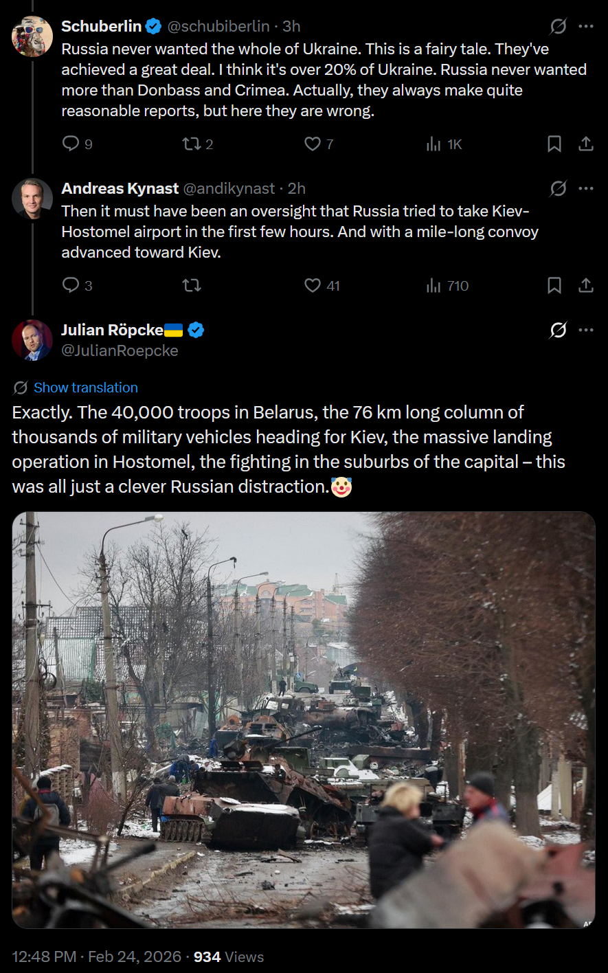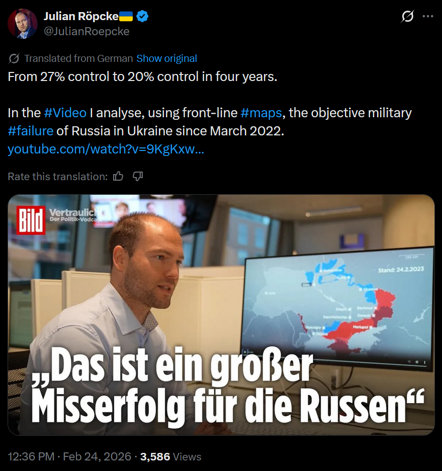 https://x.com/JulianRoepcke/status/2026244856037646487>From 27% control to 20% control in four years.>In the #Video I analyse, using front-line #maps, the objective military #failure of Russia in Ukraine since March 2022.