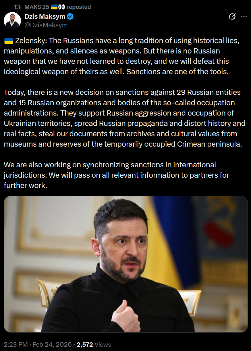 >Zelensky: The Russians have a long tradition of using historical lies, manipulations, and silences as weapons. But there is no Russian weapon that we have not learned to destroy, and we will defeat this ideological weapon of theirs as well. Sanctions are one of the tools. >Today, there is a new decision on sanctions against 29 Russian entities and 15 Russian organizations and bodies of the so-called occupation administrations. They support Russian aggression and occupation of Ukrainian territories, spread Russian propaganda and distort history and real facts, steal our documents from archives and cultural values from museums and reserves of the temporarily occupied Crimean peninsula. >We are also working on synchronizing sanctions in international jurisdictions. We will pass on all relevant information to partners for further work.LOLOL