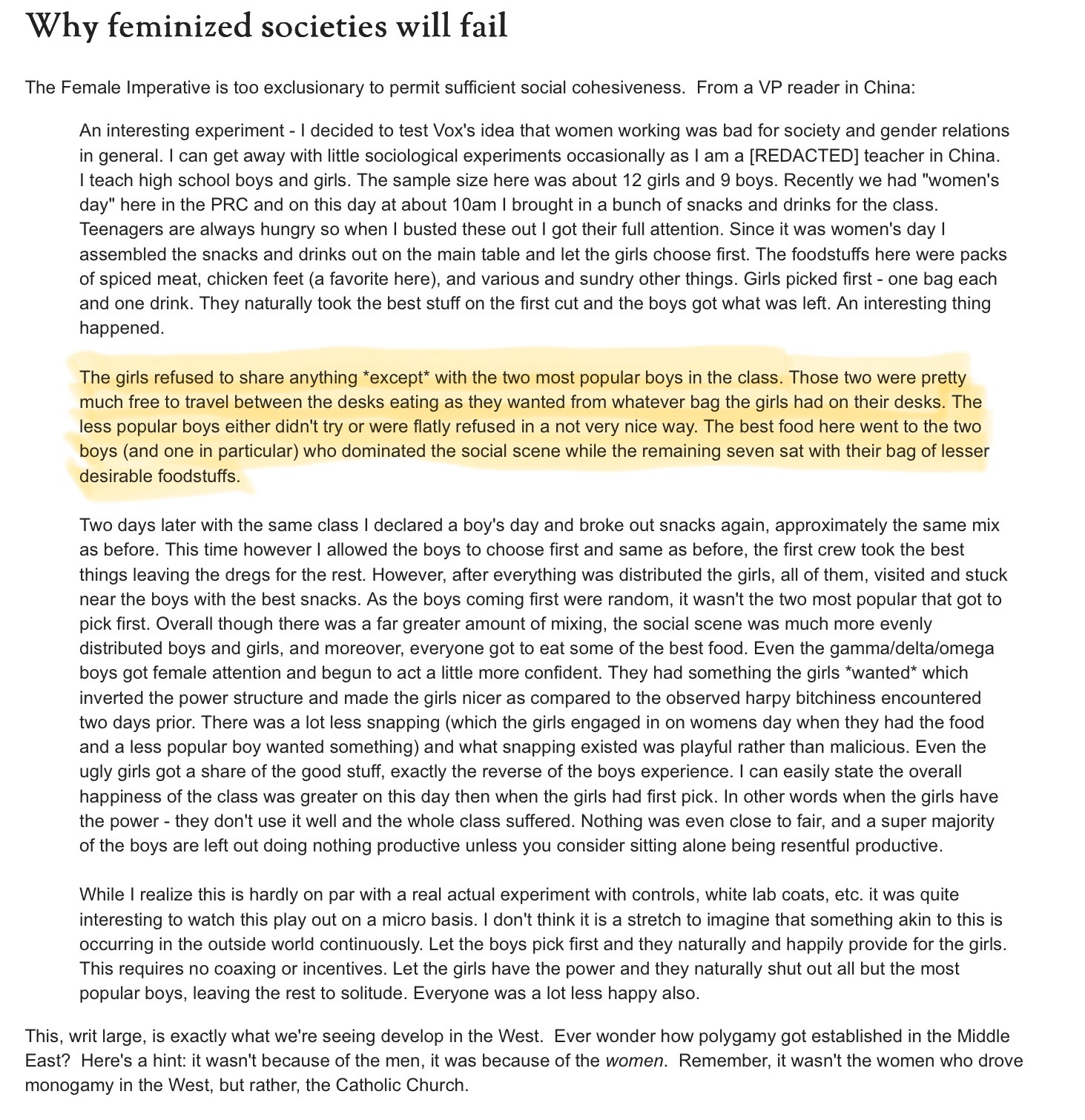>At some point women will have to reckon with the fact that they are the problem.