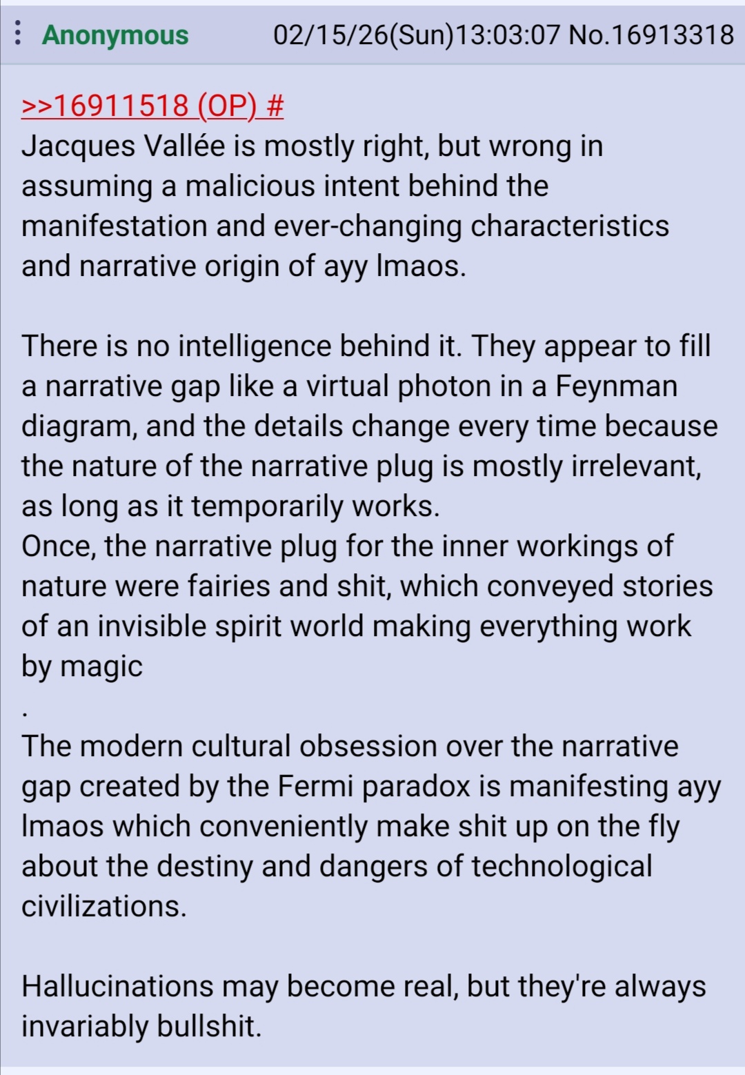>>529131933Consciousness is non-local and the nano tubules within the neurons of our brains act as quantum antenna. Consciousness exists in a sub-quantum information substrate of thought and energy from which material reality is projected as an interference pattern between our fractural of consciousness and source, God, collapsing the probability wave functions of sub-atomic particles. The sub-quantum informational substrate is a vast ocean of unlimited energy (Zero-Point) that is as rest, like the bottom of a deep ocean, at the surface is materal reality, where packets of information or particles draw energy by torsion in space time, like squeezing a wet rag. Aliens are interdimensional consciousnesses that exist in this ocean of energy that we can call the afterlife. They can see us at any time represented as a tesseract time crystal. These beings can essentially 3D print UFOs in the sky via exotic vacuum objects that create a plasma lattice which is fed information to construct UFO meta-material from the metallic condensate of the plasma lattice, layering the topological conductors and insulators atom by atom to farm sheets of magnesium, silicon, bismuth and aluminum. Which in the crystalized matrix of the metamaterial there are nano-tubules that, like our neurons begin receiving consciousness at the teraherz range.The UFO becomes possessed by these interdimensional consciousnesses as well as the disposable biologics we call the Greys that serve as drones for the UFO. These UFOs can intercept human consciousness, manipulating our perception and experience. They act as a control system carefully managing our reality and destiny. No way any of this gets disclosed. Normies brains would explode. On the plus side, they can't hurt our souls.