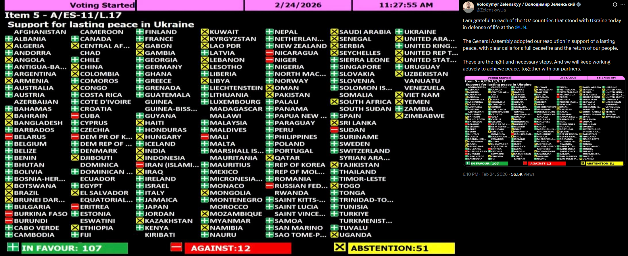 >I am grateful to each of the 107 countries that stood with the Ukraine today in defense of life at the @UN.>The General Assembly adopted our resolution in support of a lasting piss, with clear calls for a full cisfire and the return of our people.>These are the right and necessary steps. And we will keep working actively to achieve piss, together with our partners.