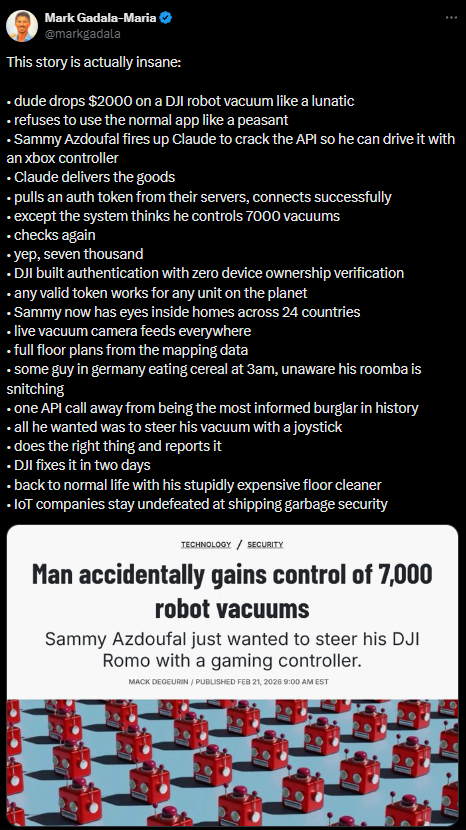 One sperg in the US who wanted to control his DJI robo-vacuum with a vidya controller now has live video/audio feeds of every house on earth with one of these chink spyware kits.Full explanation:https://x.com/markgadala/status/2026078762862006747