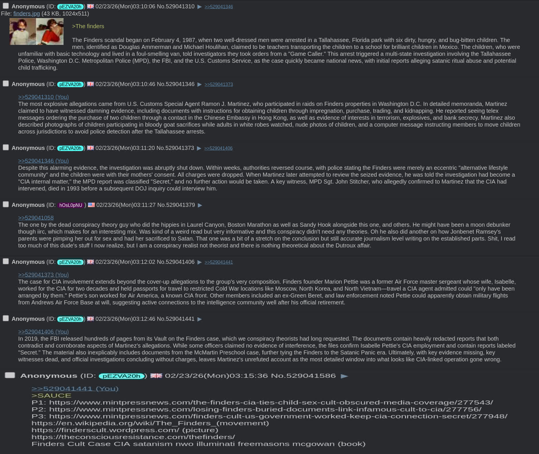 WHERE WE ARE:Normies are learning about this kind of stuff for the first time with the Epstein files. We need to seize the oportunity to pull it all out of the memory hole. Dutroux, Norman/Gacy/Corll, westminster dossier, Franklin scandal, Finders Cult, NXIVM, all of it.We are at the beginning of a mass awakening to total international infiltration of institutional power by a criminal conspiracy with pure evil at its core. The Epstein stuff is the tip of the iceberg, there’s a high likelihood this is connected to and similar to all the rings we’ve seen before. Whether it’s the Dutroux Affair, or the Franklin Scandal, details from past cases can offer crucial investigative clues today. It’s looking like they are even all connected…If you have an ounce of righteousness in your soul, your time and attention in this thread matter.GOAL:Put the pieces together in the highest level context possible, communicate it in as obviously true, hilarious, and condensed a form as possible, and spread it. Get as many people as possible on the same page. Divide and conquer ends now. Bringing these motherfuckers to justice is something we all are united behind. We are already unified against them, but because glowniggers have no incentive to shill this as a movement, the algos, the billboards, and the influencers are quieter than expected. When the public realizes how unified we already are, waves of the leaders we need will start springing forward. Ignite the flame of courage in your fellow man. It begins with us. Break all echo chambers.HOW TO HELP ITT?Dig, meme, archive, organize. Scour archive.4plebs.org for stuff & bring it back to the thread. Spread truth as far and wide as possible.You are here for a reason, anon. Let’s come together to clean up these evil fucks, and unlock the best of all possible timelines.