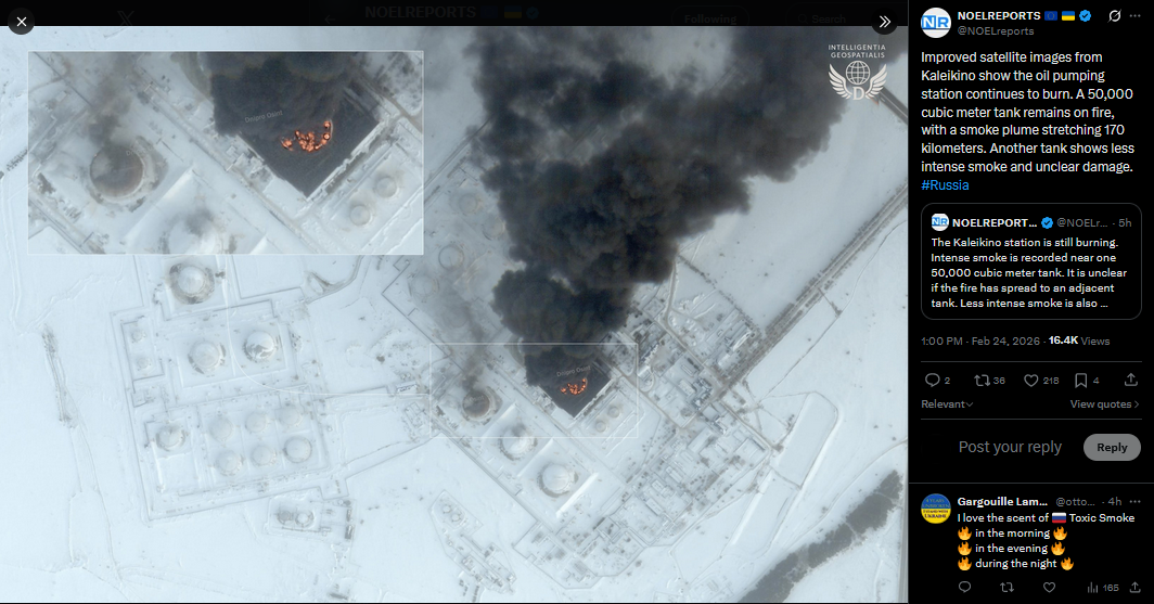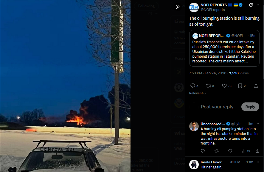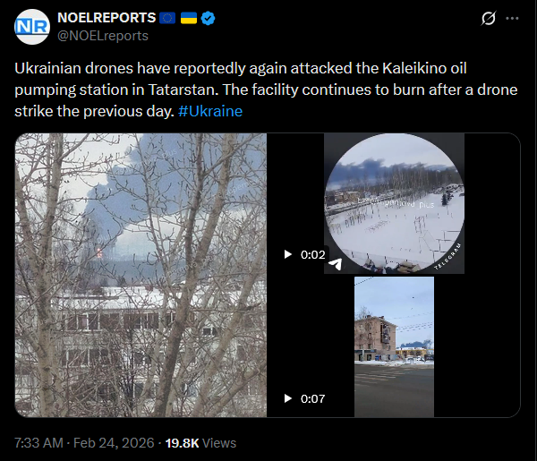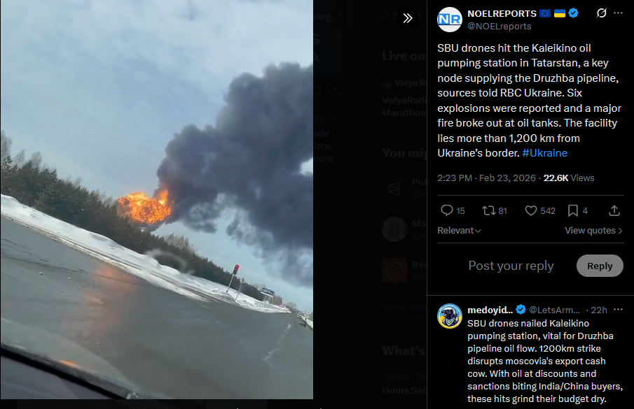 >>529147031 thanks for the Bake SBU drones hit the Kaleikino oil pumping station in Tatarstan, a key node supplying the Druzhba pipeline, sources told RBC Ukraine. Six explosions were reported and a major fire broke out at oil tanks. The facility lies more than 1,200 km from Ukraine’s border. #Ukrainehttps://x.com/NOELreports/status/2025939563017846902?s=20>23th