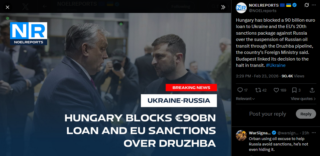 Hungary has blocked a 90 billion euro loan to Ukraine and the EU’s 20th sanctions package against Russia over the suspension of Russian oil transit through the Druzhba pipeline, the country’s Foreign Ministry said. Budapest linked its decision to the halt in transit. #Ukrainehttps://x.com/NOELreports/status/2025941102973337666?s=20>23th
