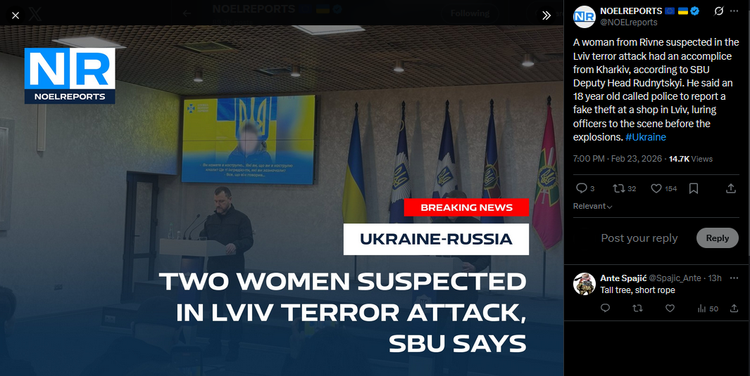 A woman from Rivne suspected in the Lviv terror attack had an accomplice from Kharkiv, according to SBU Deputy Head Rudnytskyi. He said an 18 year old called police to report a fake theft at a shop in Lviv, luring officers to the scene before the explosions. #Ukrainehttps://x.com/NOELreports/status/2026009347742974231?s=20>23th