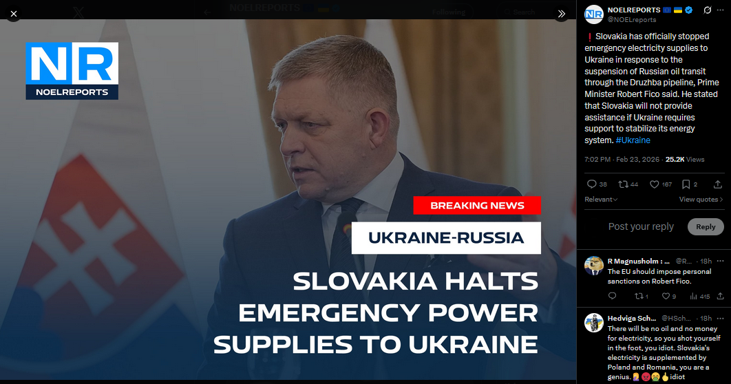 Slovakia has officially stopped emergency electricity supplies to Ukraine in response to the suspension of Russian oil transit through the Druzhba pipeline, Prime Minister Robert Fico said. He stated that Slovakia will not provide assistance if Ukraine requires support to stabilize its energy system. #Ukrainehttps://x.com/NOELreports/status/2026009844029829175?s=20>23th