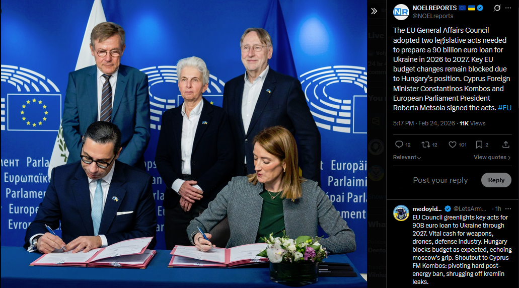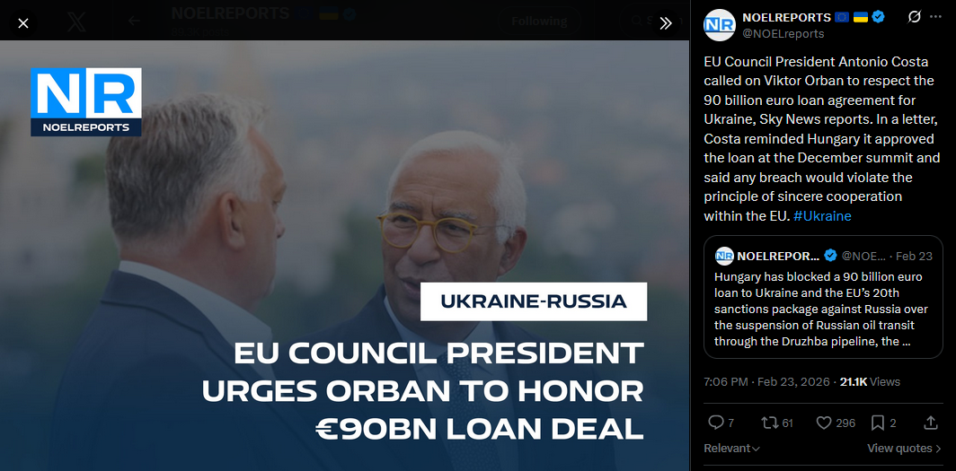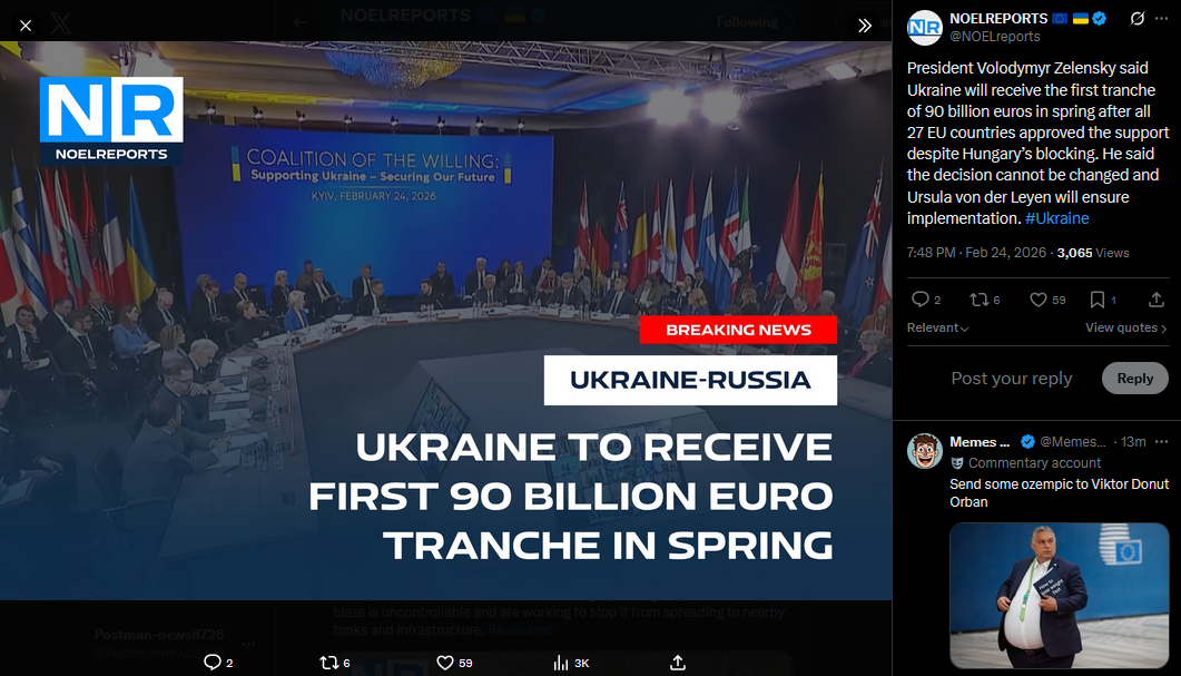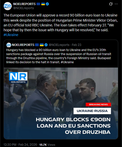 The European Union will approve a record 90 billion euro loan to Ukraine this week despite the position of Hungarian Prime Minister Viktor Orban, an EU official told RBC Ukraine. The loan takes effect February 27. "We hope that by then the issue with Hungary will be resolved," he said. #Ukrainehttps://x.com/NOELreports/status/2026273582918066407?s=20>9h