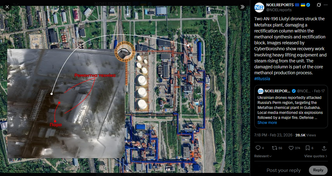 Two AN-196 Liutyi drones struck the Metafrax plant, damaging a rectification column within the methanol synthesis and rectification block. Images released by CyberBoroshno show recovery work involving heavy lifting equipment and steam rising from the unit. The damaged column is part of the core methanol production process. #Russiahttps://x.com/NOELreports/status/2026013819084894621?s=20>23thhttps://files.catbox.moe/e22tpc.jpg
