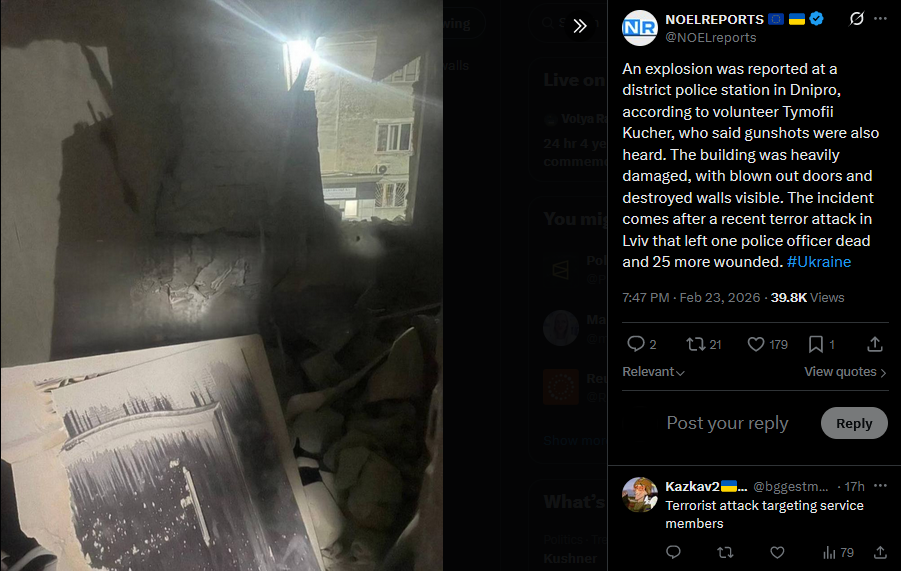 An explosion was reported at a district police station in Dnipro, according to volunteer Tymofii Kucher, who said gunshots were also heard. The building was heavily damaged, with blown out doors and destroyed walls visible. The incident comes after a recent terror attack in Lviv that left one police officer dead and 25 more wounded. #Ukrainehttps://x.com/NOELreports/status/2026021075226914883?s=20>23th