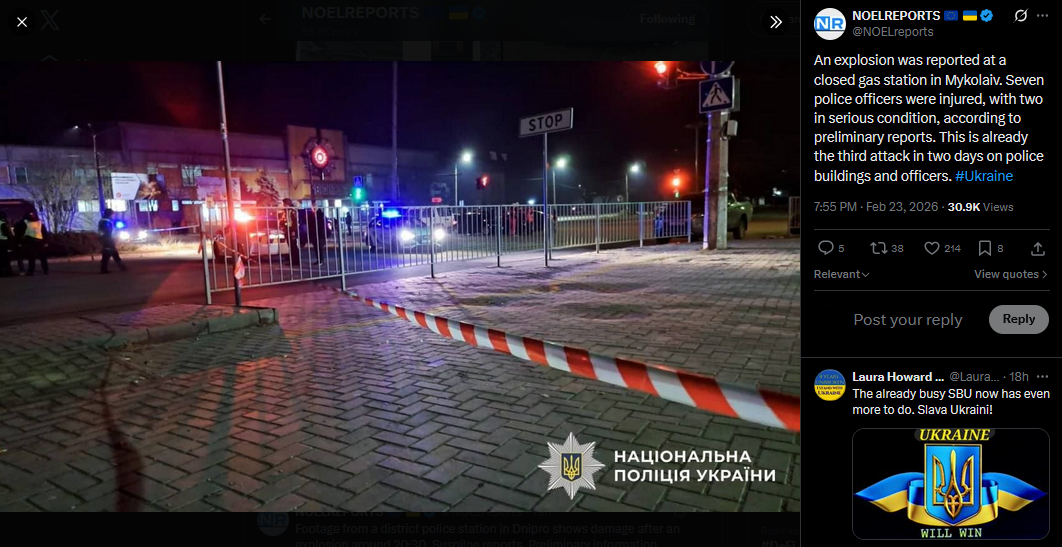 An explosion was reported at a closed gas station in Mykolaiv. Seven police officers were injured, with two in serious condition, according to preliminary reports. This is already the third attack in two days on police buildings and officers. #Ukrainehttps://x.com/NOELreports/status/2026023148970234073?s=20>23th